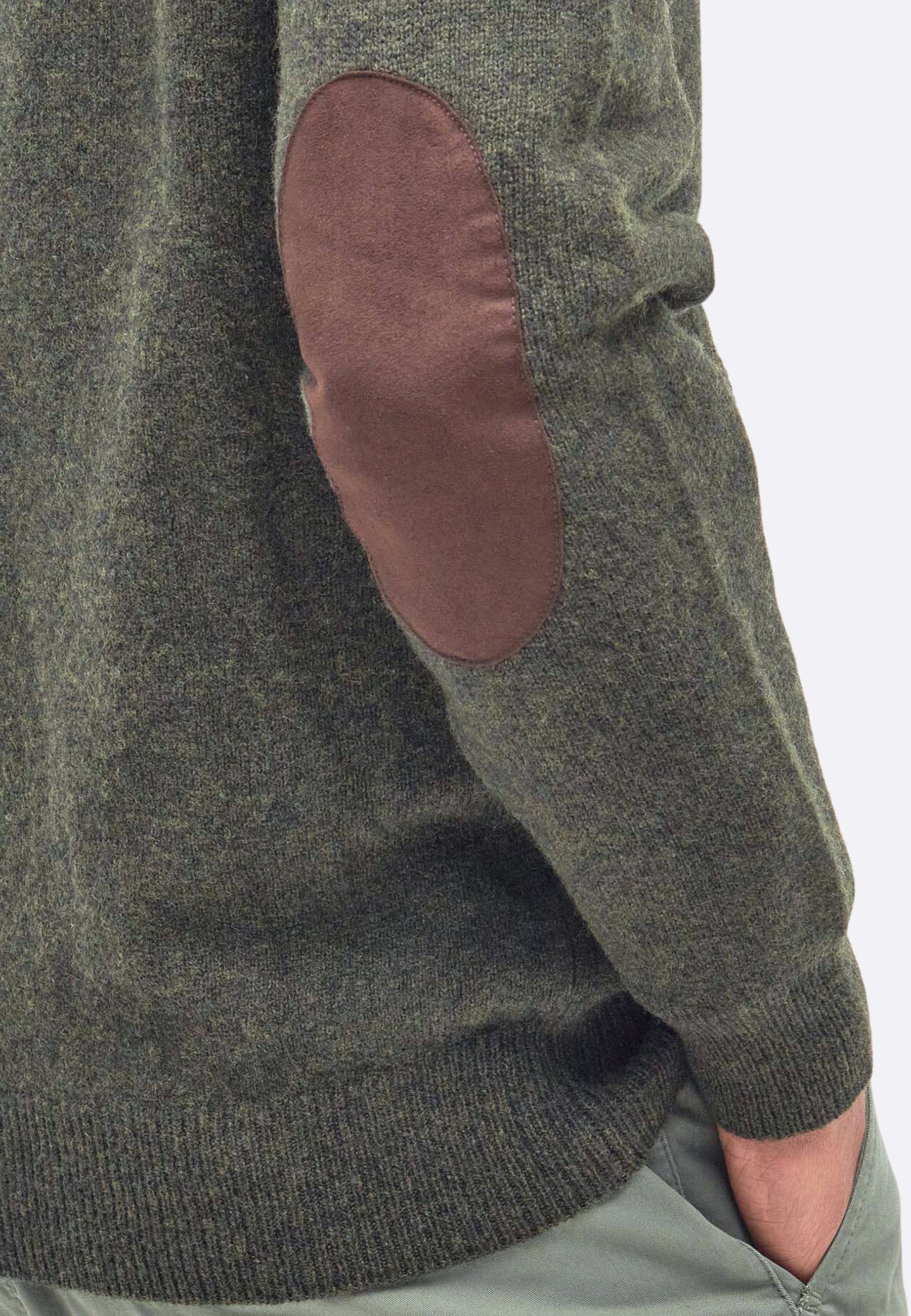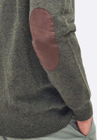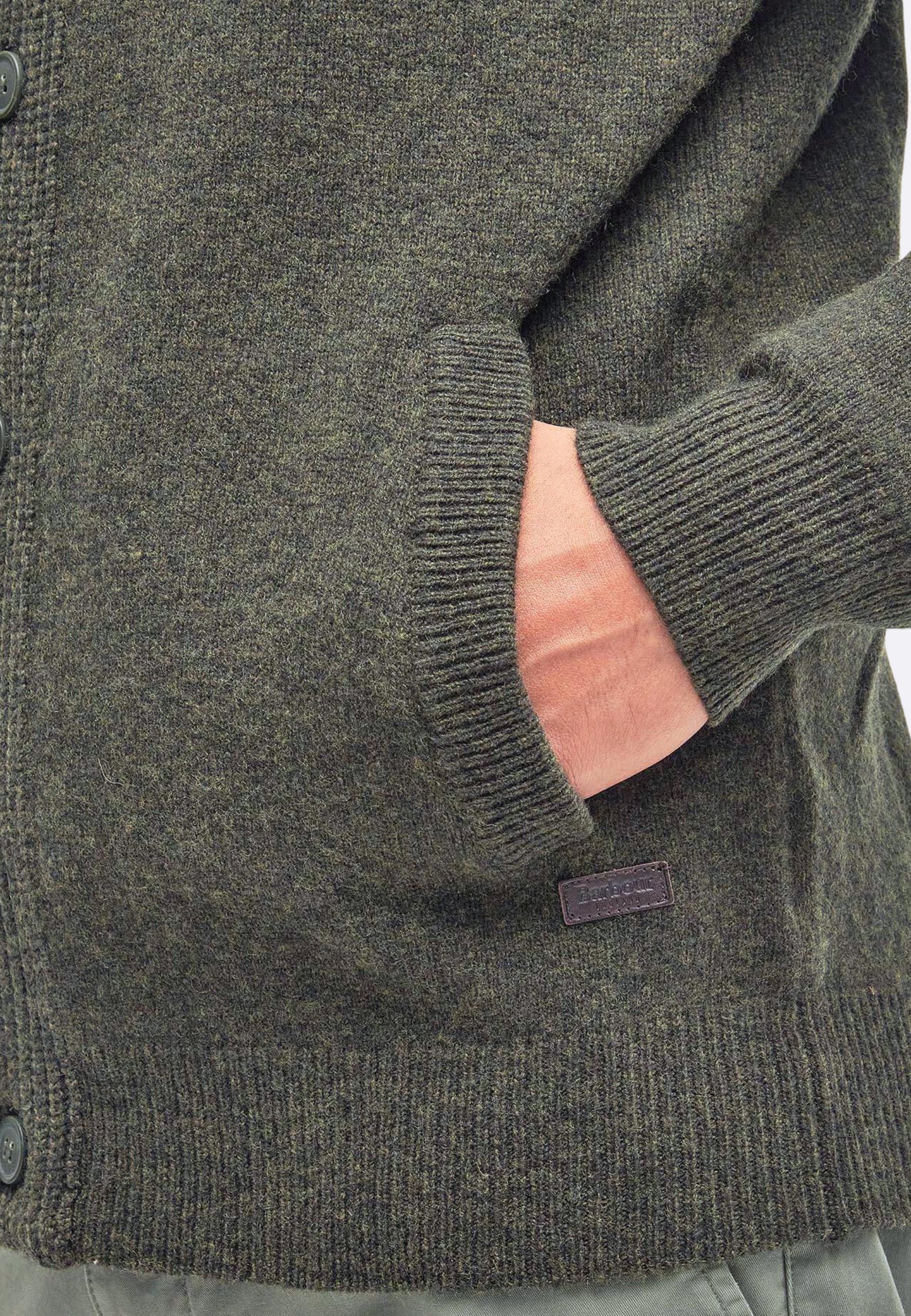 BARBOUR Cardigan Patch verde da uomo. Questo cardigan a maglia grossa è realizzato in pura lana d'agnello e presenta toppe in alcantara sui gomiti e un ricamo personalizzato sul petto. La vestibilità classica rende questo capo facile da sovrapporre a camicie e T-shirt. Il modello indossa una taglia L ed è alto 190cm. Si consiglia un lavaggio a mano. Stagione autunno inverno.