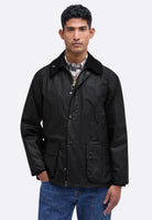 Giacca Barbour Bedale in cotone cerato in colore nero. Colletto classico in velluto a costine. Chiusura con zip e bottoni automatici. Tasche con patta e bottoni automatici. Il modello indossa la taglia 40. Collezione Barbour uomo Autunno/Inverno 2025-26.