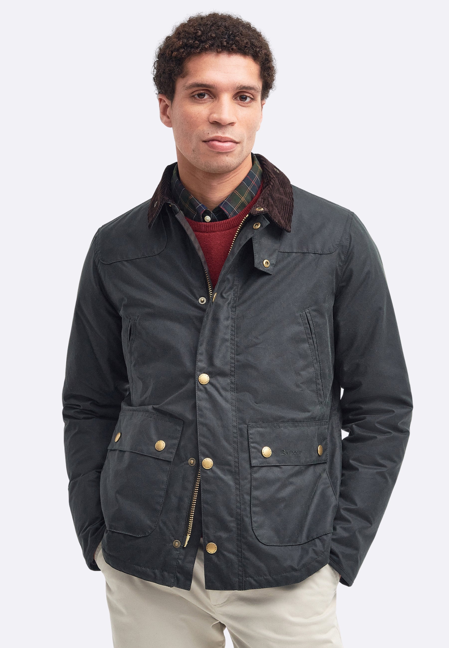 Giacca Barbour modello Reelin Verde, cerata in superficie, con colletto in velluto a coste, chiusura con zip e bottoni a pressione, tasche con patta applicate.
