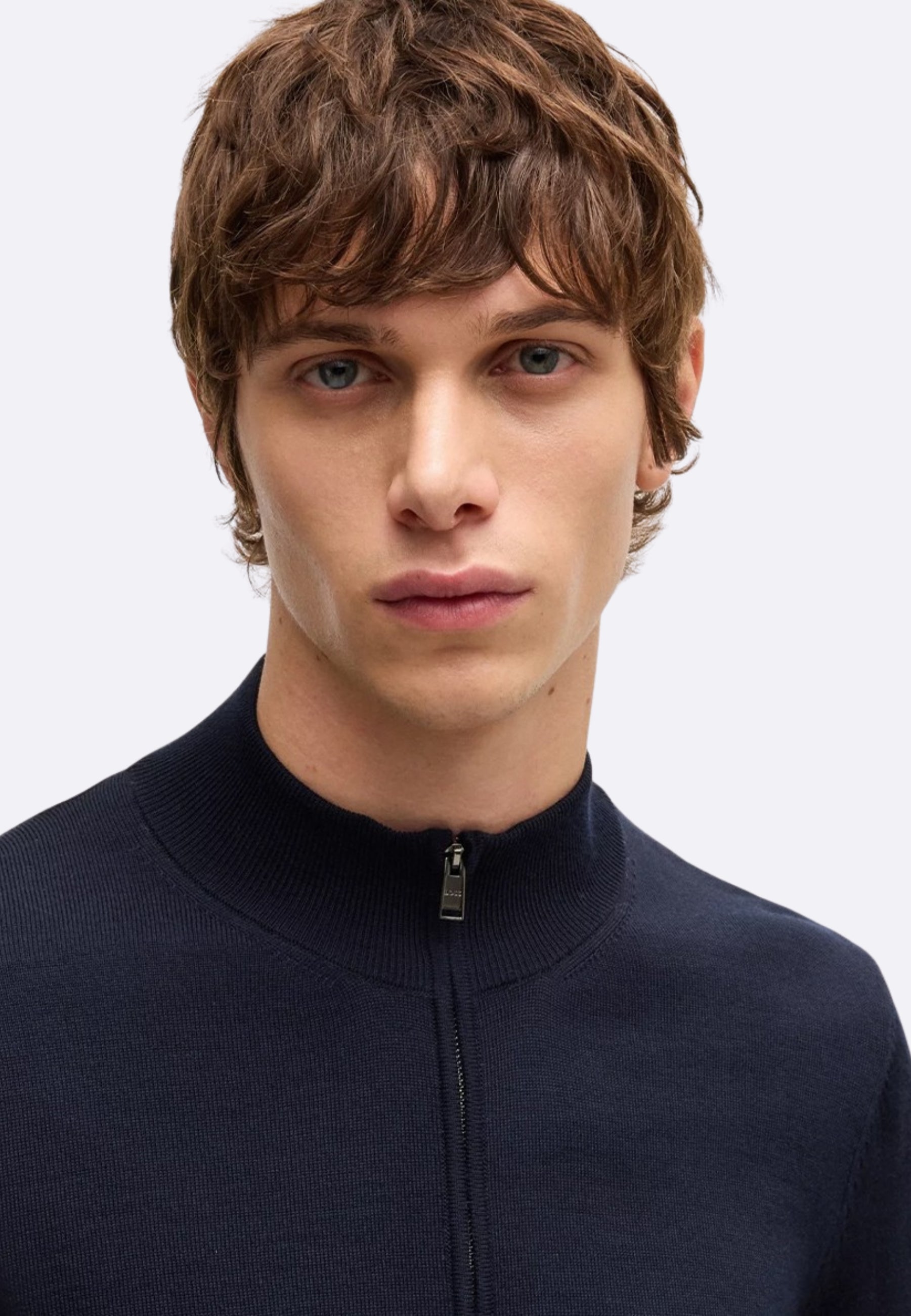 Un versatile cardigan BOSS Uomo. Caratterizzato da vestibilità regular fit e zip sulla parte anteriore, questo morbidissimo cardigan presenta un logo BOSS ricamato sulla parte sinistra del petto e le righe tipiche del marchio all'interno del colletto. Per i nostri prodotti RESPONSIBLE usiamo sempre almeno il 60% di materie prime più sostenibili. Questo capo è realizzato con lana certificata e proveniente da allevamenti responsabili. Per noi, essere un allevamento responsabile significa essere mulesing-free e rispettare gli standard previsti dalle Cinque libertà per la tutela degli animali.