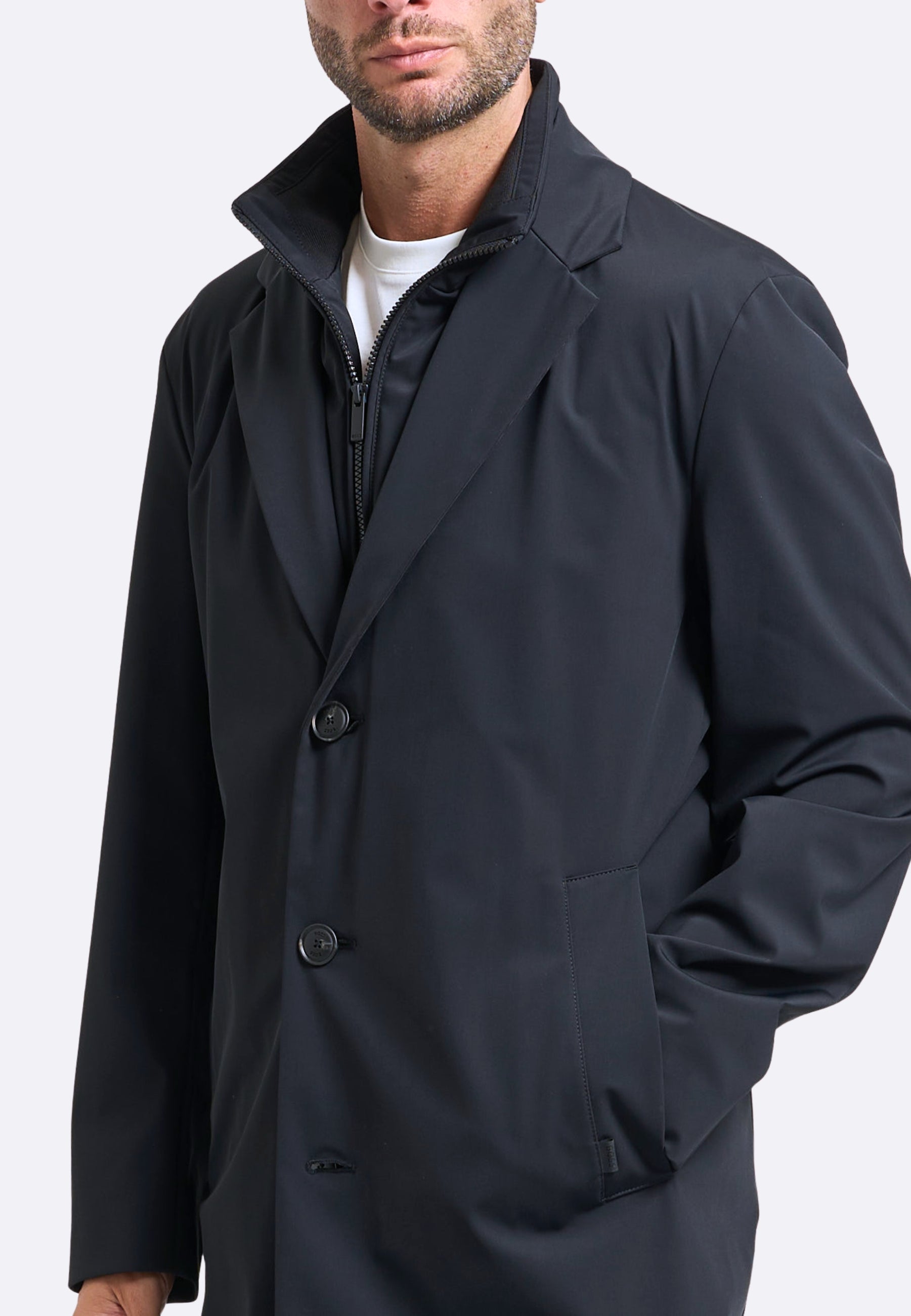 Soprabito 3 in 1 per uomo di Boss in tessuto elasticizzato. Giacca foderata con revers a specchio, bottoni, tasche frontali. Gilet removibile con collo alto e chiusura fullzip. Regular fit. Il modello indossa una 48IT ed è alto 1.85m