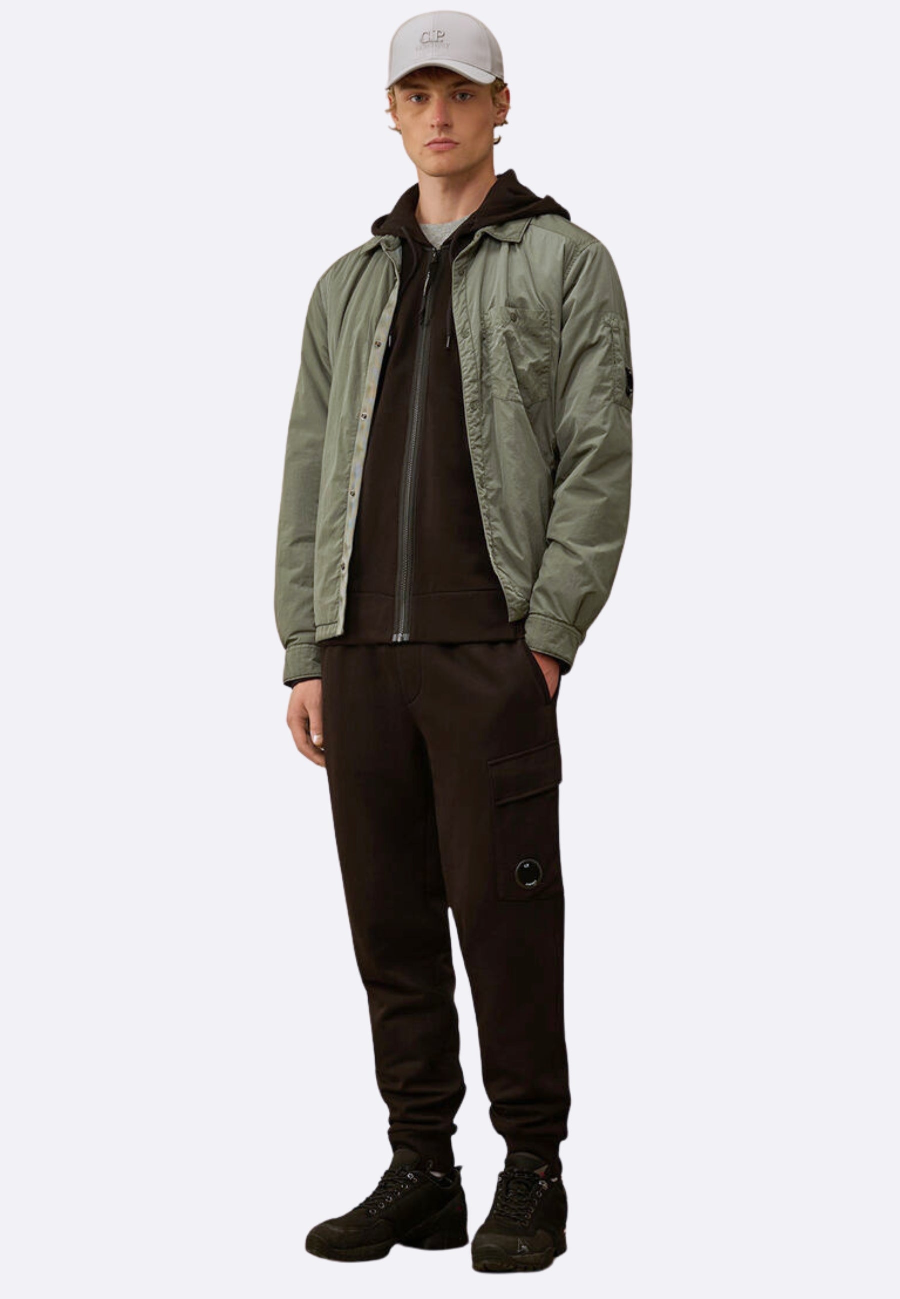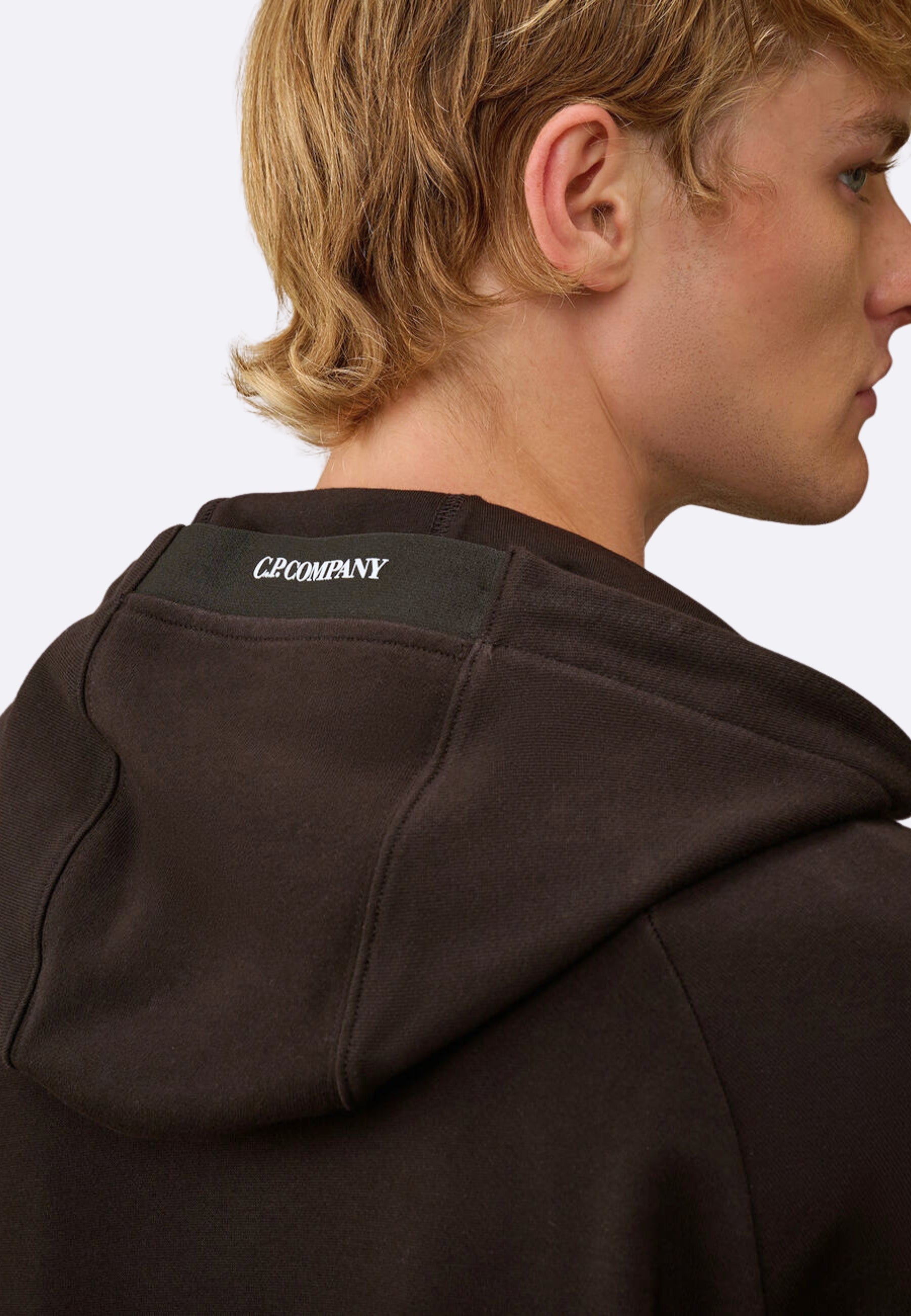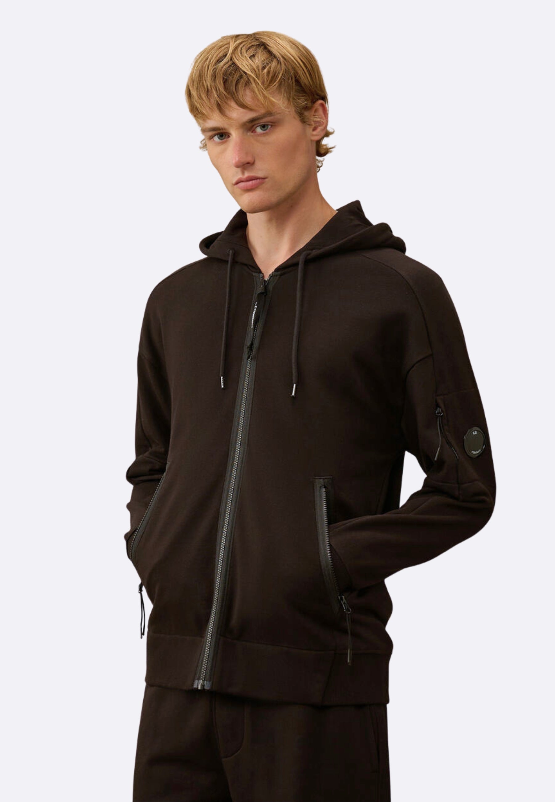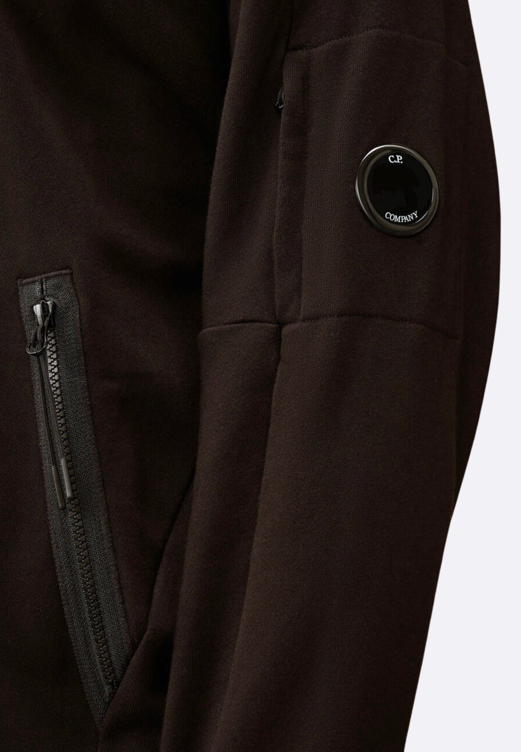 Felpa full zip realizzata in Diagonal Raised Fleece, un cotone spazzolato a trama diagonale di peso medio. Il tessuto morbido assicura comfort e libertà di movimento. Il capo presenta cappuccio regolabile con logo ricamato e l’iconica Lente di C.P. Company. Completata da tasche laterali con zip, polsini e orlo a costine con fori per i pollici. Regular fit.