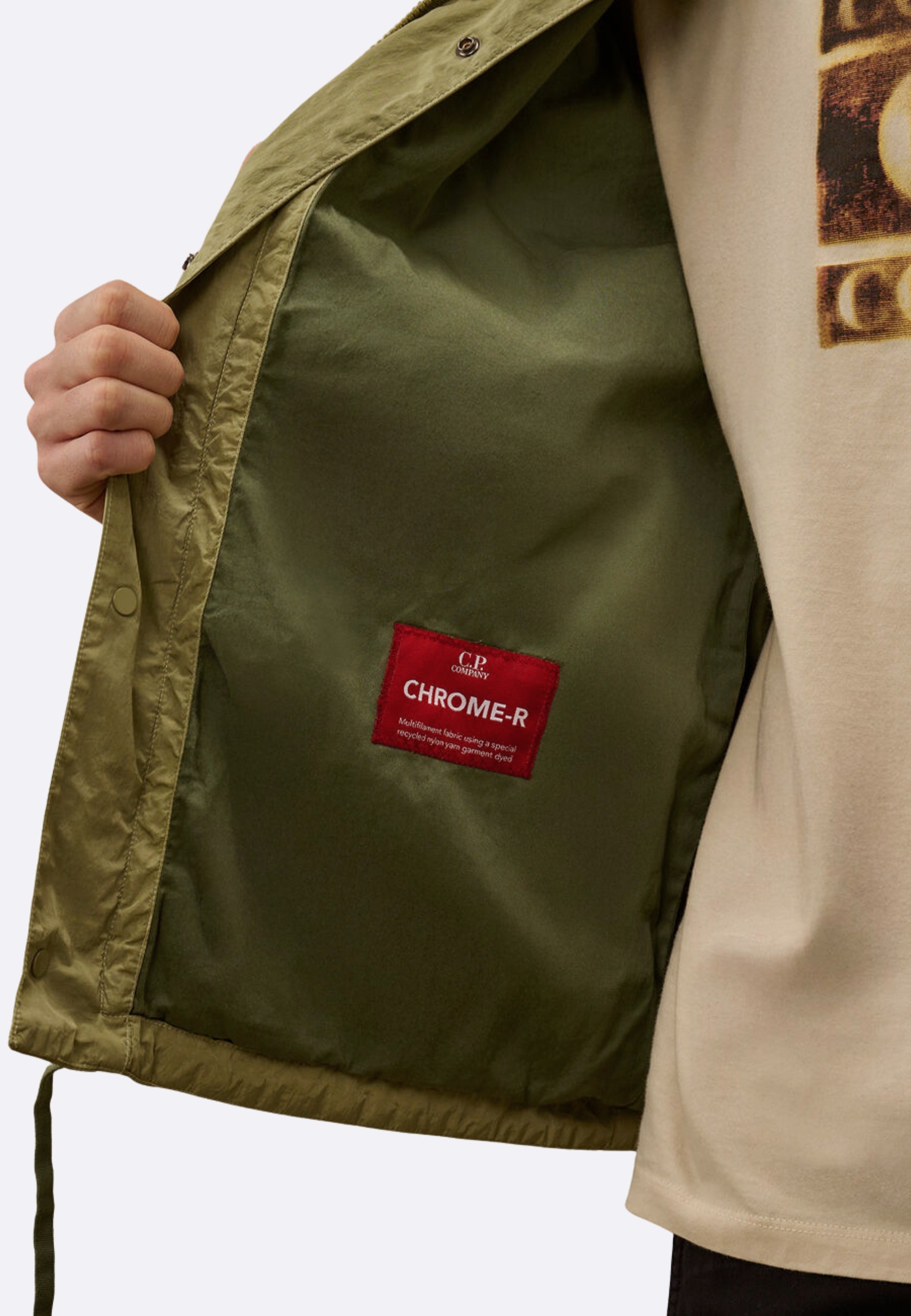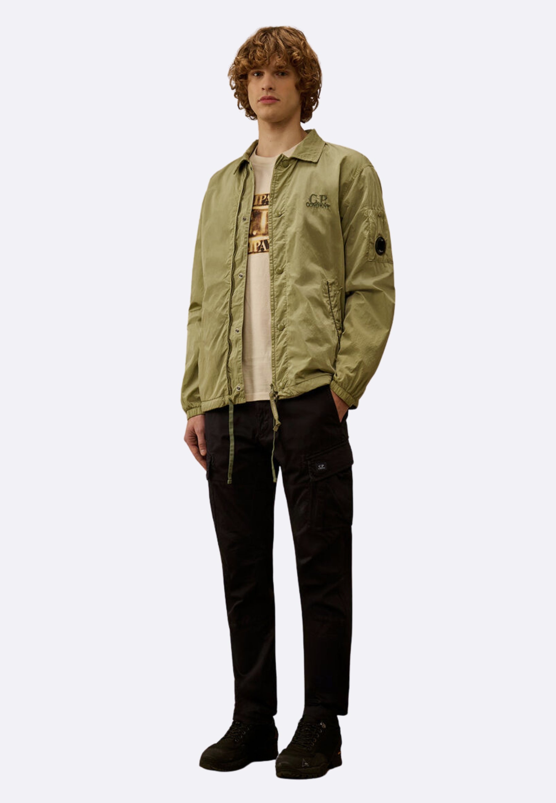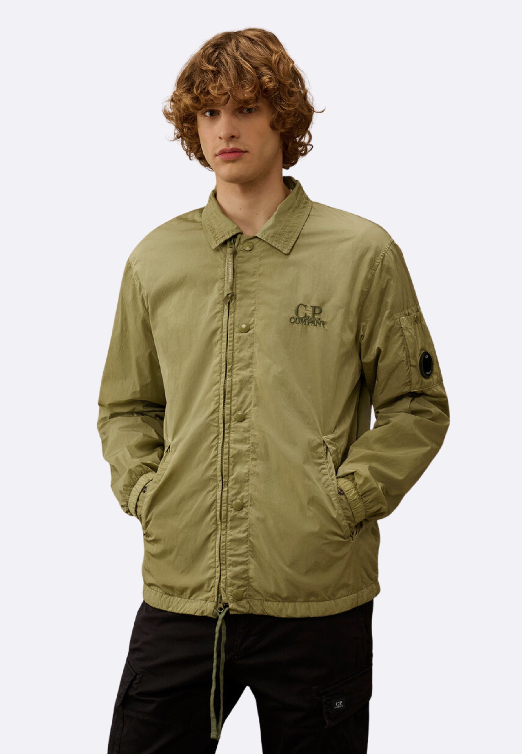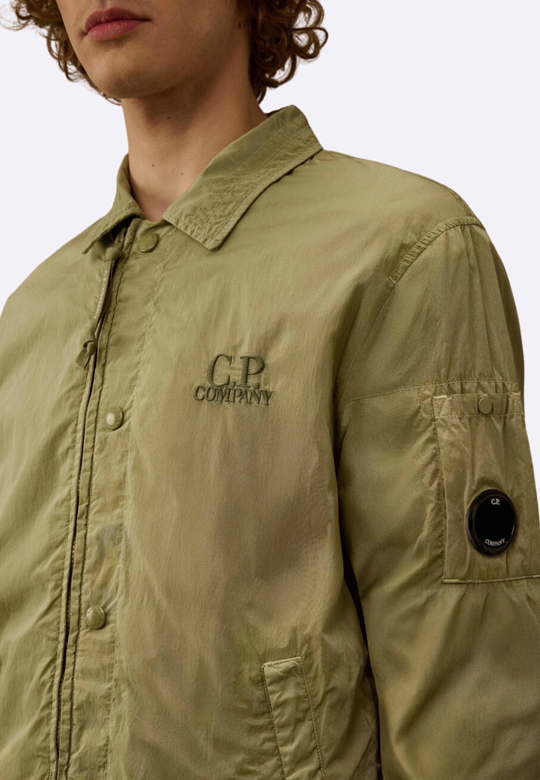 Overshirt realizzata in Chrome-R, un nylon multifilamento lucido 100% riciclato, ottenuto dal recupero e dalla rigenerazione di scarti di produzione per dare vita a una nuova fibra rinnovata certificata dal Global Recycled Standard (GRS). Il modello presenta un colletto classico, chiusura full zip nascosta con bottoni automatici, logo ricamato sul petto e sul retro, tasche laterali con bottoni automatici e un taschino con l’iconica Lente di C.P. Company sulla manica. La fodera in cotone assicura comfort e traspirabilità, mentre i polsini elasticizzati e l’orlo regolabile con coulisse garantiscono una vestibilità funzionale e confortevole. La overshirt è tinta in capo per ottenere sfumature di tono e profondità cromatica uniche, che si esaltano con il tempo e l’utilizzo. Regular fit.