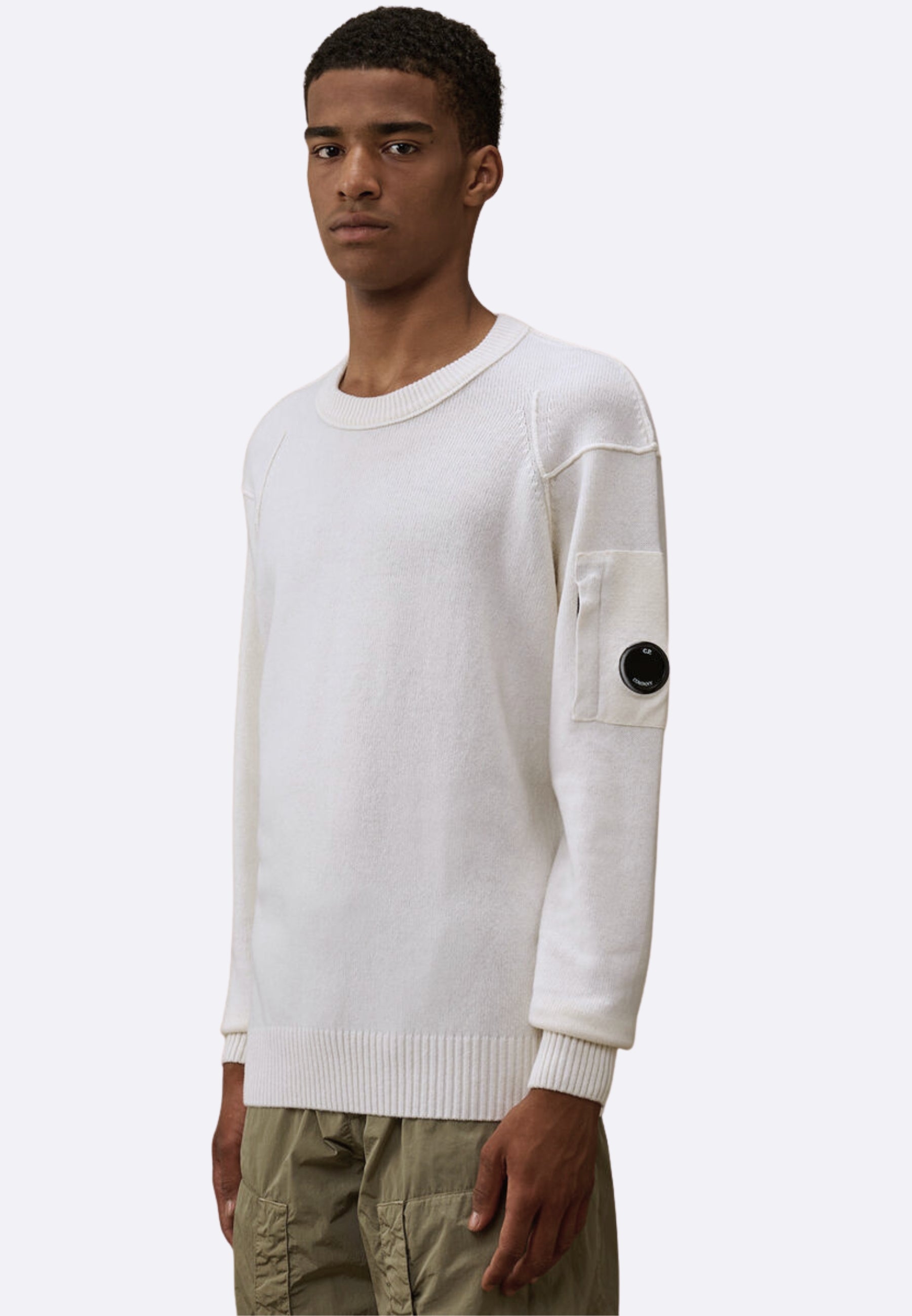 Realizzata in pregiato lambswool per una finitura soffice e fine, che risulta leggera e morbida al tatto, questa maglia girocollo semplice con cuciture rialzate è rifinita con l'iconica lente di C.P. Company sulla tasca della manica.