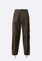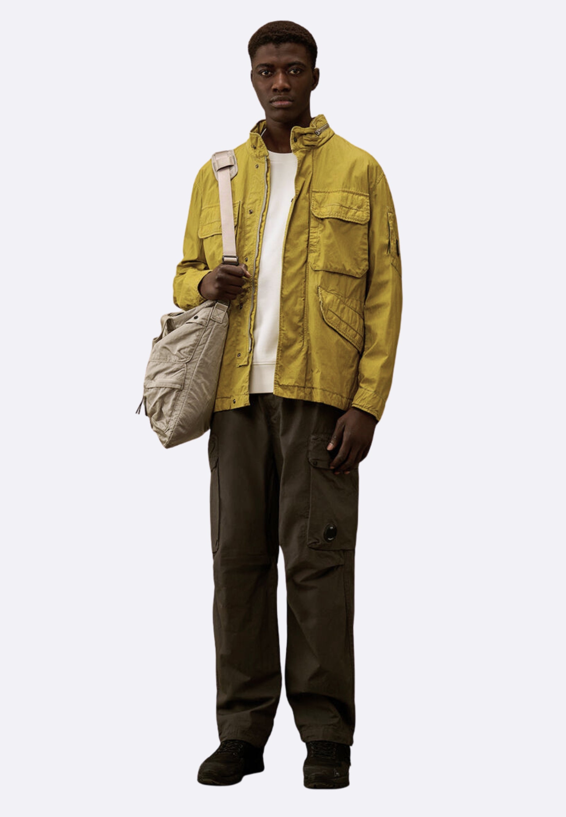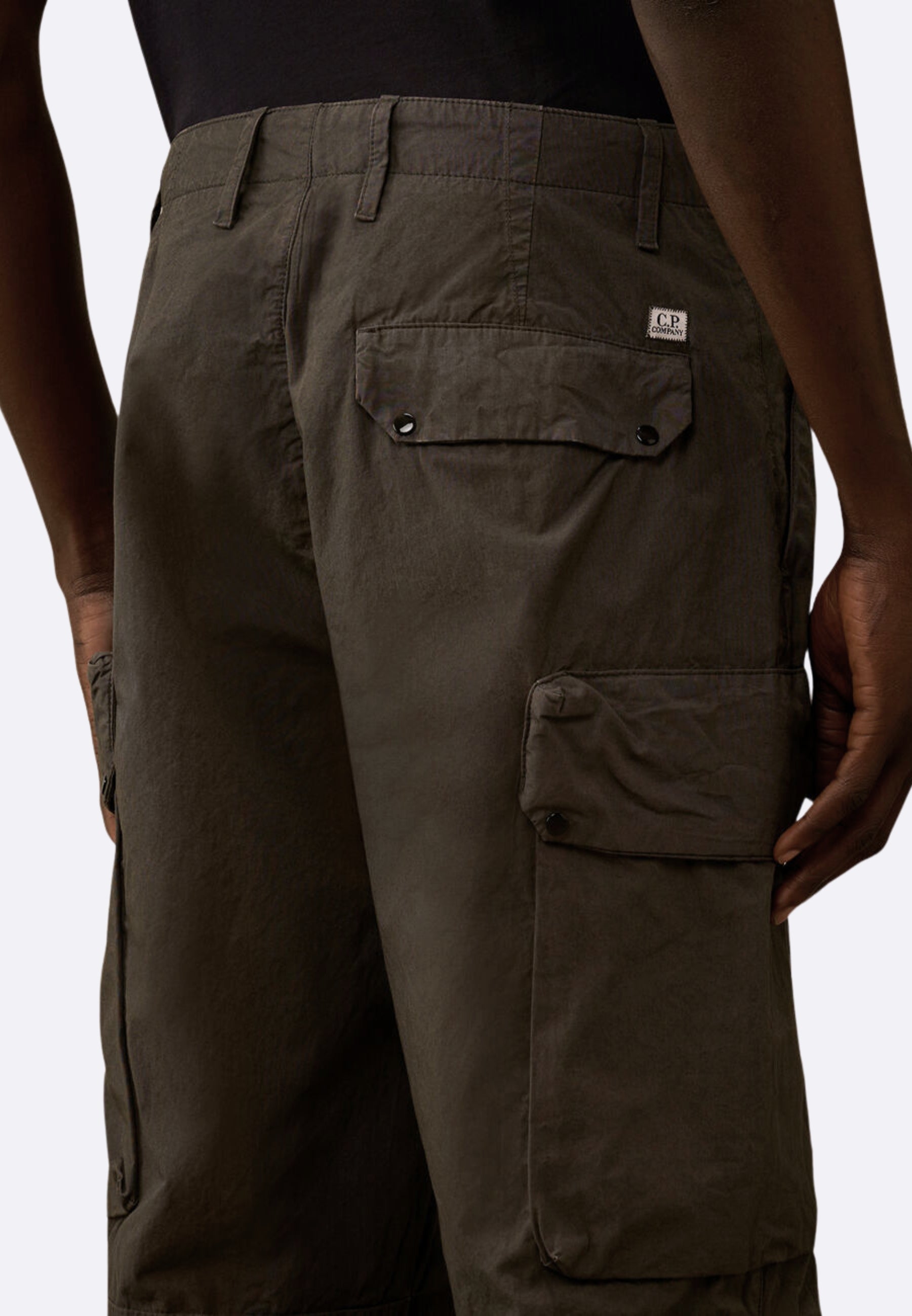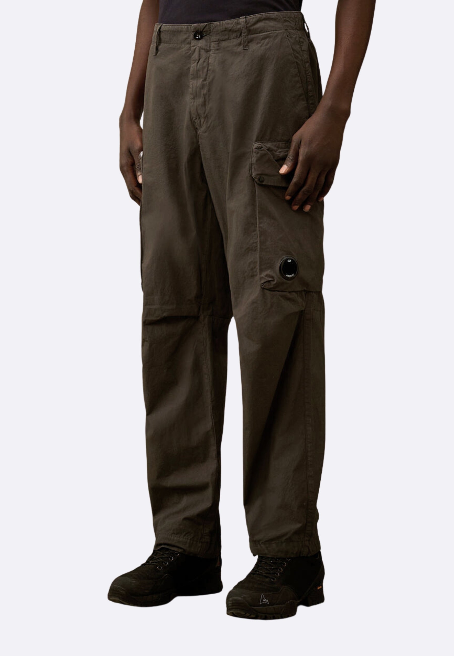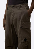 Pantaloni cargo realizzati in Micro-Reps, un tessuto di cotone ad alta densità caratterizzato da una struttura compatta e una mano morbida. Il modello presenta chiusura con bottone e zip, passanti per cintura e tasche laterali. Dettagli funzionali includono tasche con patta e bottoni automatici con l’iconica Lente di C.P. Company, una tasca posteriore con patta e un’etichetta con logo applicata sul retro. L’orlo regolabile con coulisse completa il design. Made in Italy. Boxy fit.