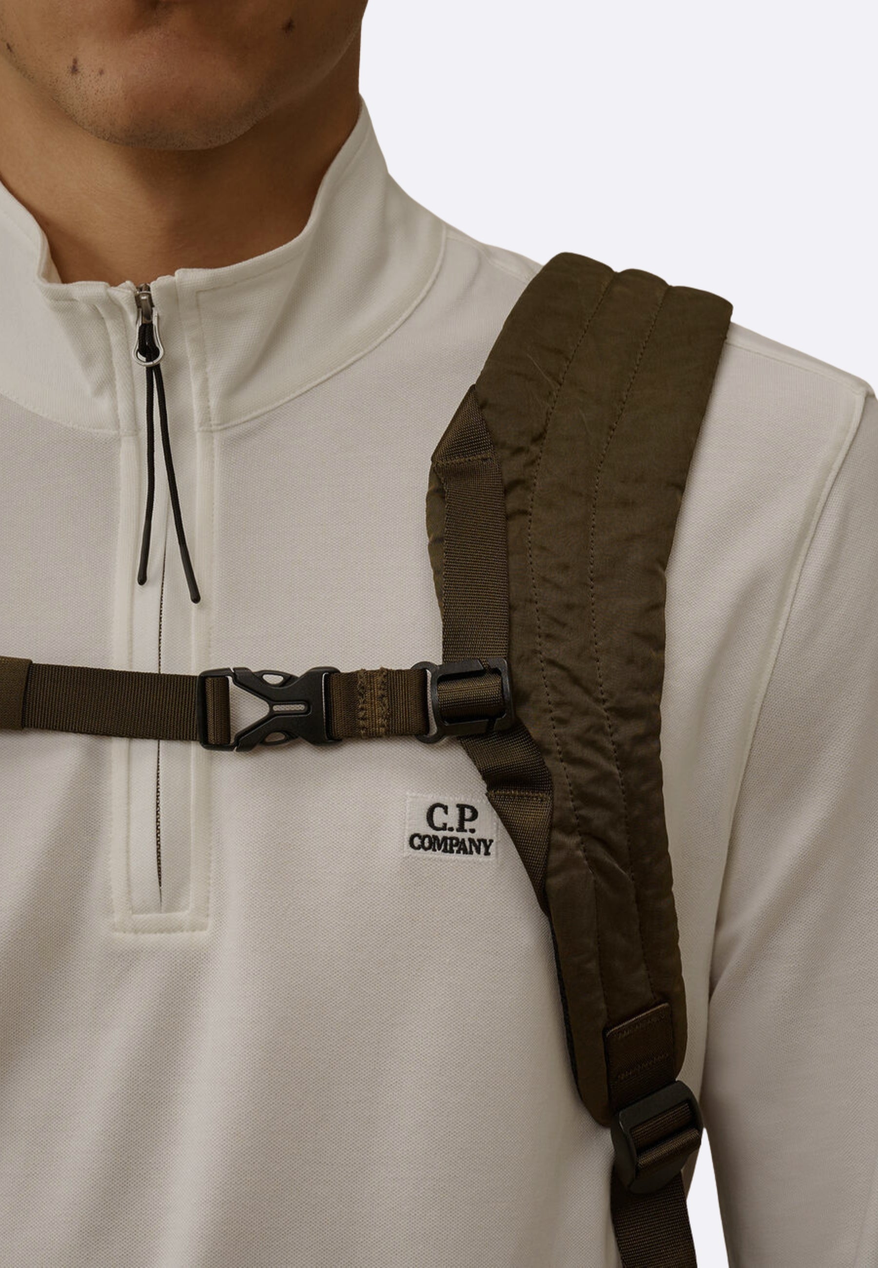 Zaino realizzato in Nylon B, un nylon multifilamento in raso di ispirazione militare. Lo zaino è dotato di cinghie regolabili con fibbie, spallacci imbottiti e una maniglia per il trasporto. Il design include una tasca nascosta con zip con C.P. L'iconica lente dell'azienda, una tasca inferiore con zip, una rete laterale e una tasca interna a scatto. Indumento tinto e trattato anti-goccia.