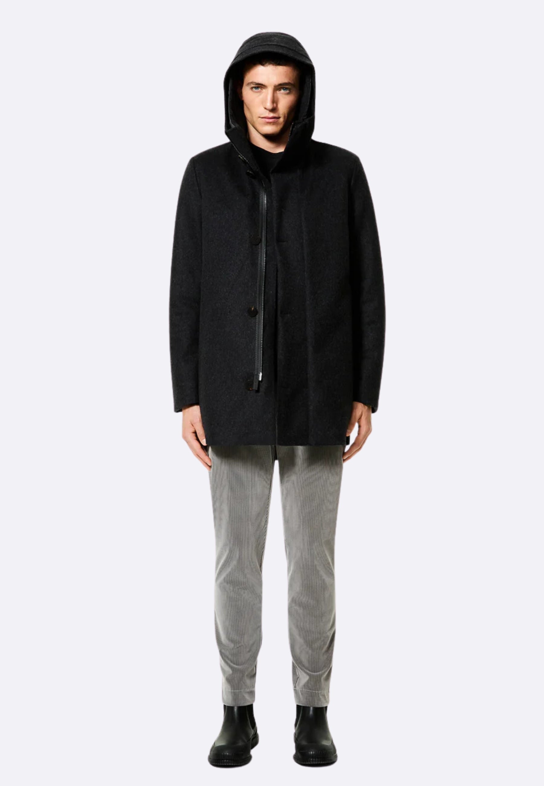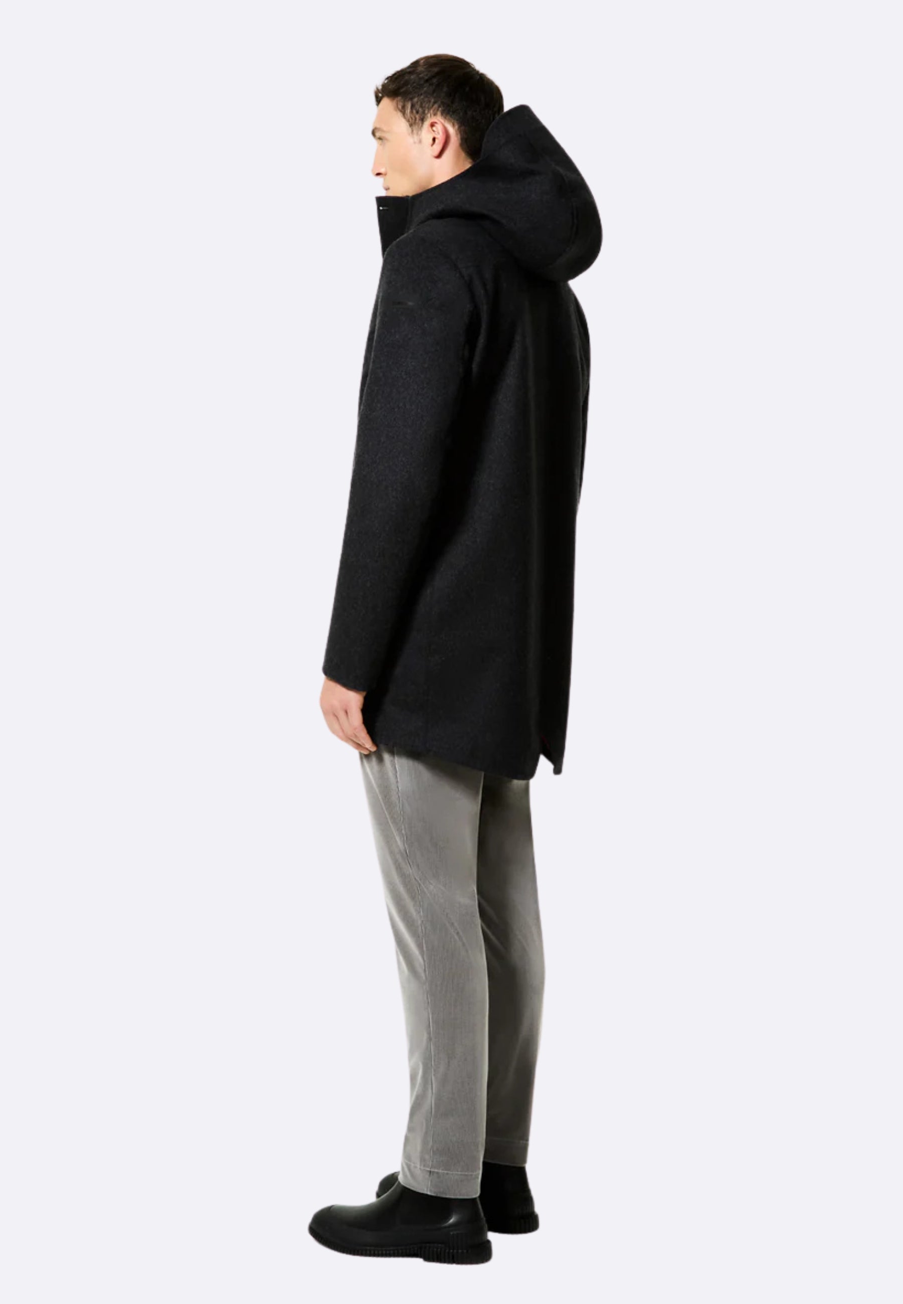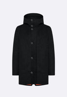 Design, finiture e stilemi si combinano con efficacia nel dare vita a un capospalla invernale protettivo e dalla ricercata originalità. Il parka con lunghezza trequarti acquisisce un'estetica innovativa grazie al tessuto a membrana traspirante con esterno in pregiato panno di lana Moessmer, caldo e consistente. Il modello è strutturato dalla costruzione interamente nastrata e presenta il cappuccio avvolgente fisso. Sul davanti si distingue per l'abbottonatura a pressione, che nasconde la chiusura a zip integrale in metallo a doppio cursore. Questa è affiancata dalle tasche chiuse da zip con termonastratura nera. La calda e soffice imbottitura in piuma d'anatra 90/10 è contenuta nei canali tubici dell'innovativo sistema Floating Shield, che garantisce un eccezionale comfort e una vestibilità impeccabilmente diritta. L'interno è completato dal taschino chiuso con zip invisibile, sottolineato dal doppio filetto arancione e dall'inconfondibile tag a cuore "Made with love, designed in Tuscany". Il logo a microiniezione nero sulla manica sinistra conferisce il tocco iconico a un parka di grande contemporaneità, disponibile nelle tonalità scure dell'inverno.