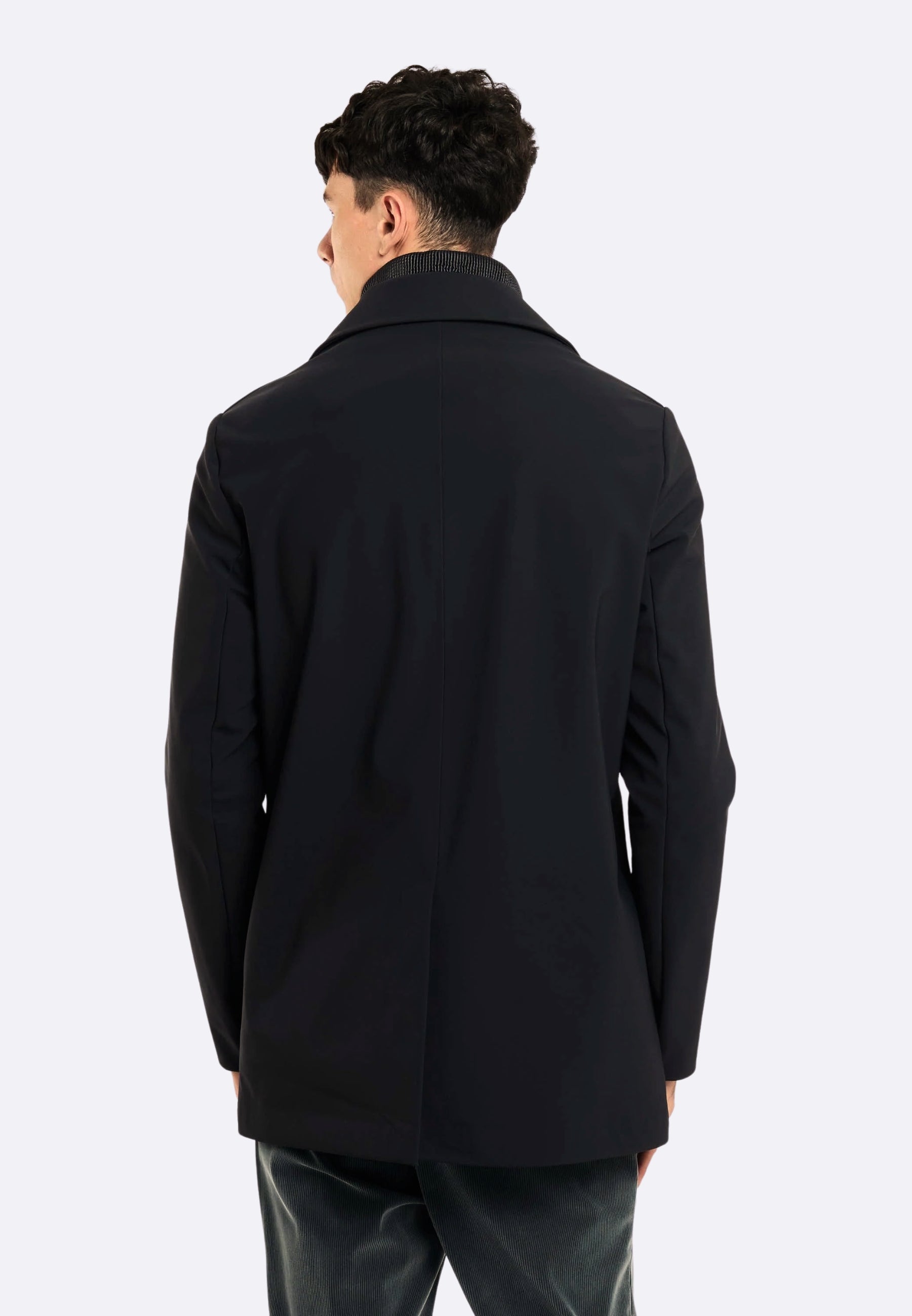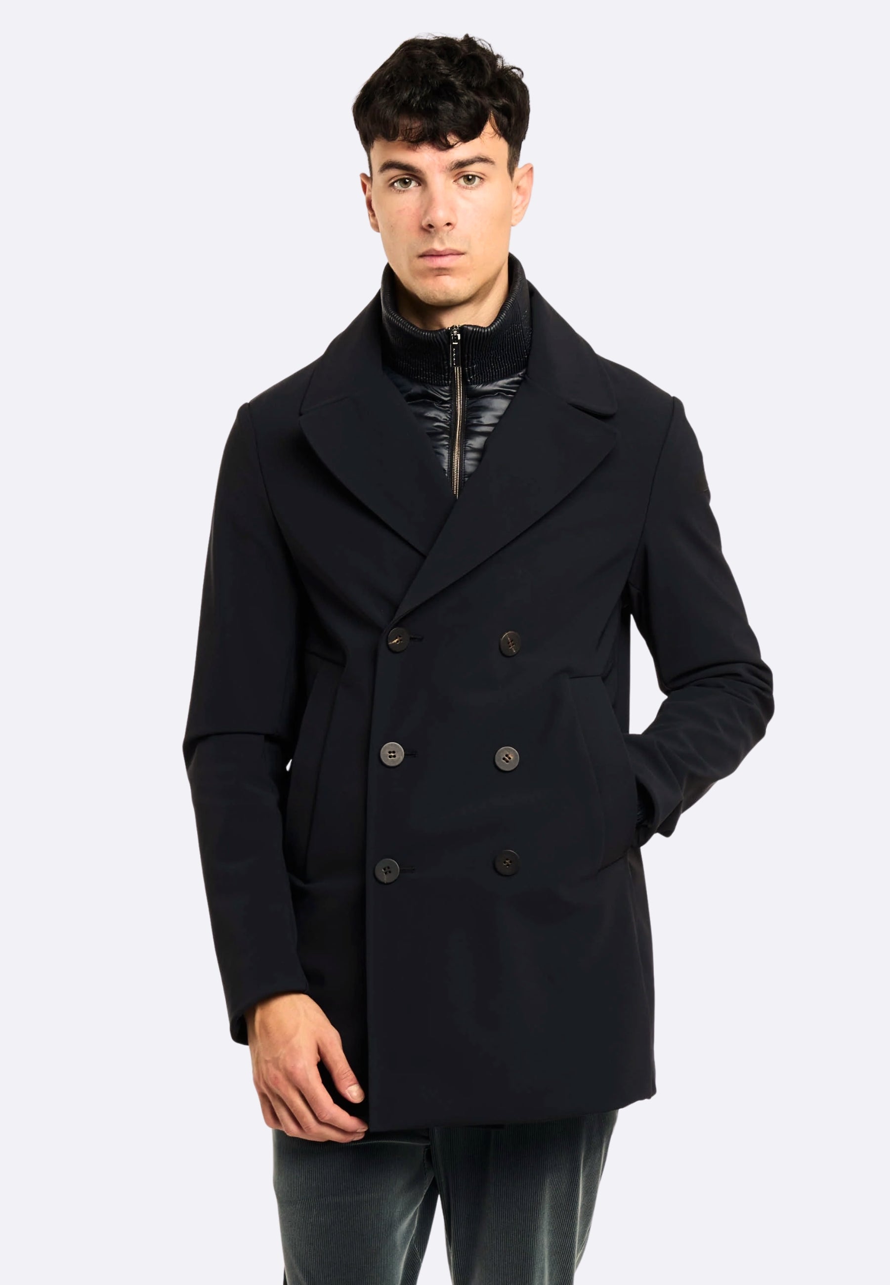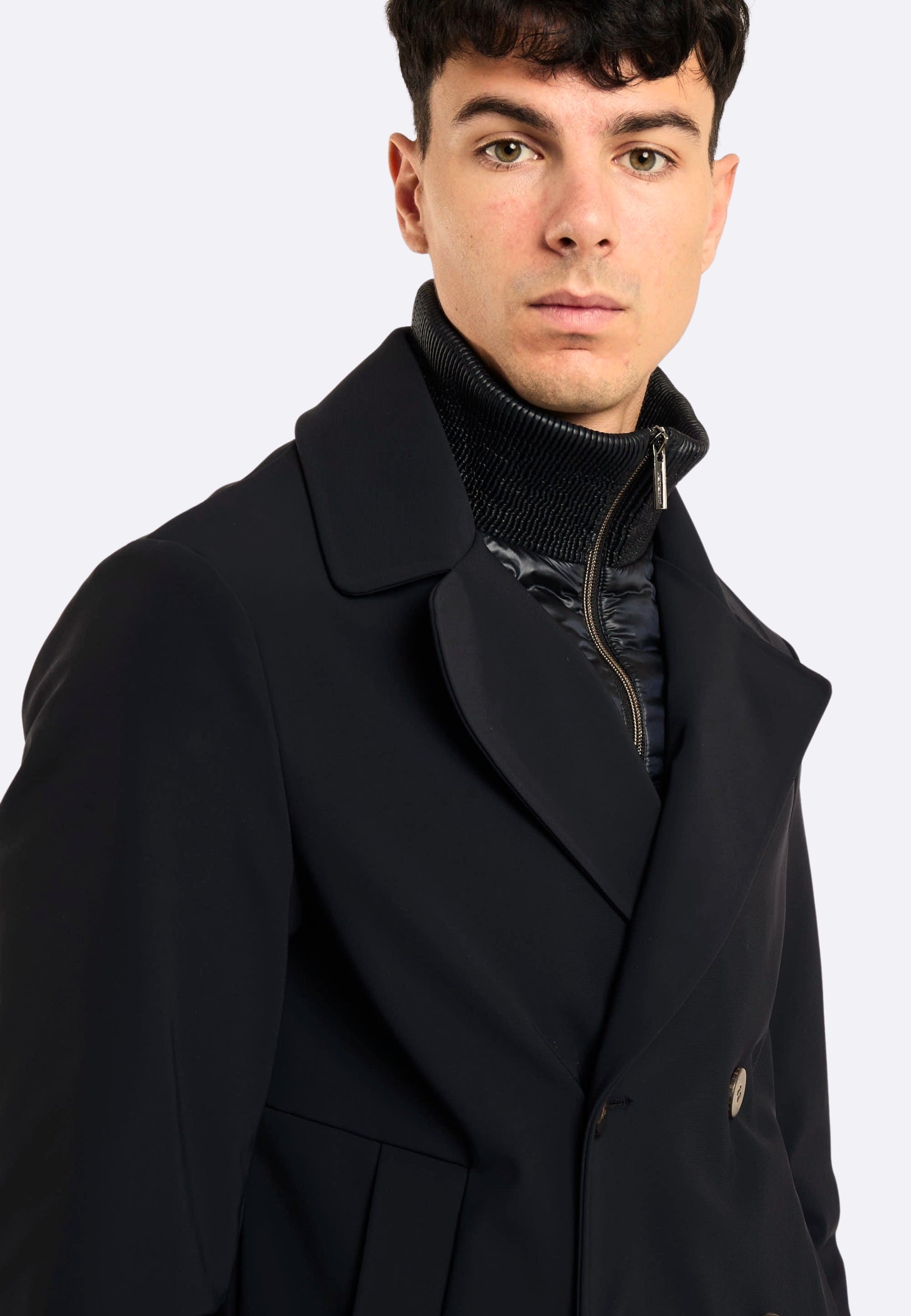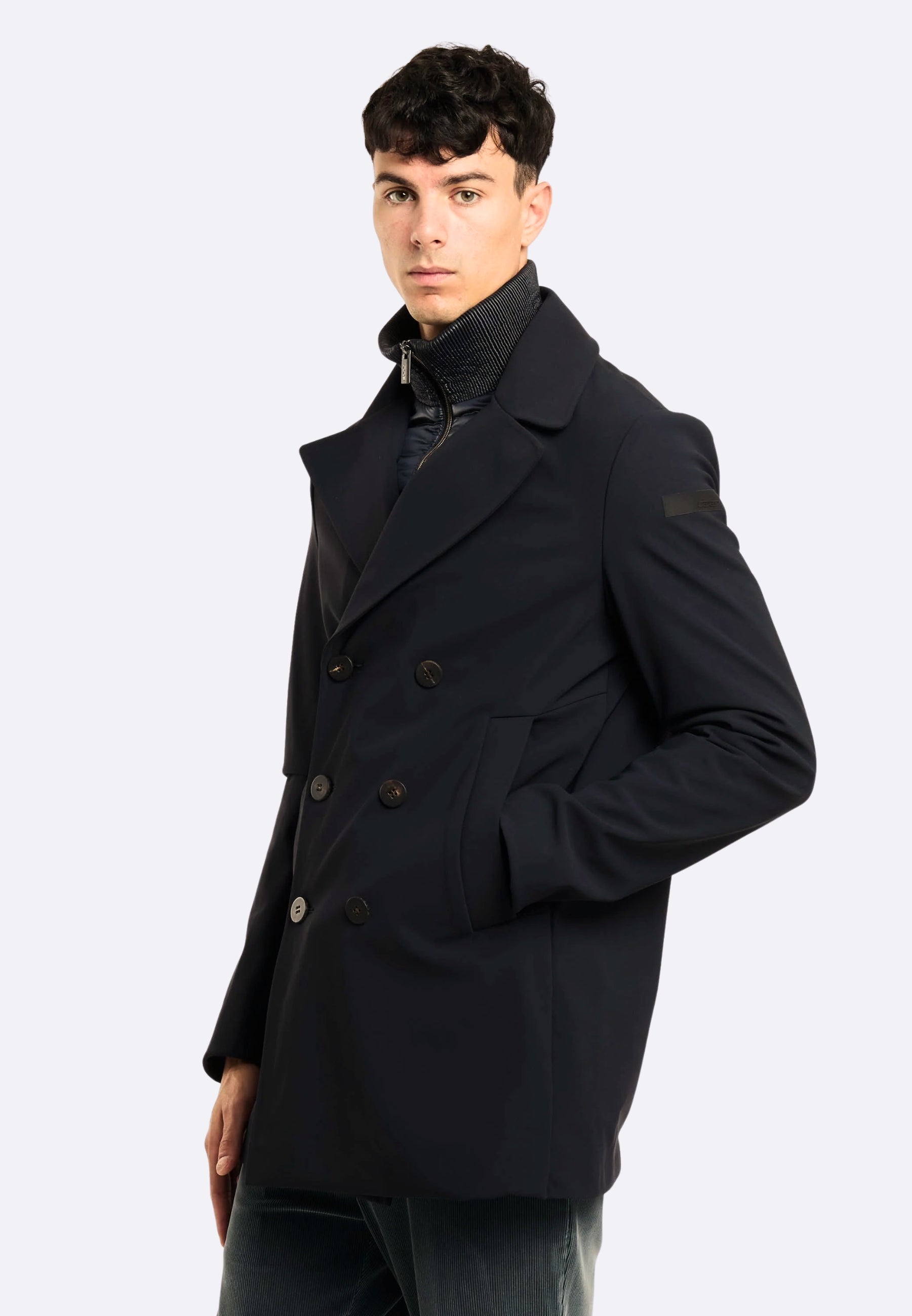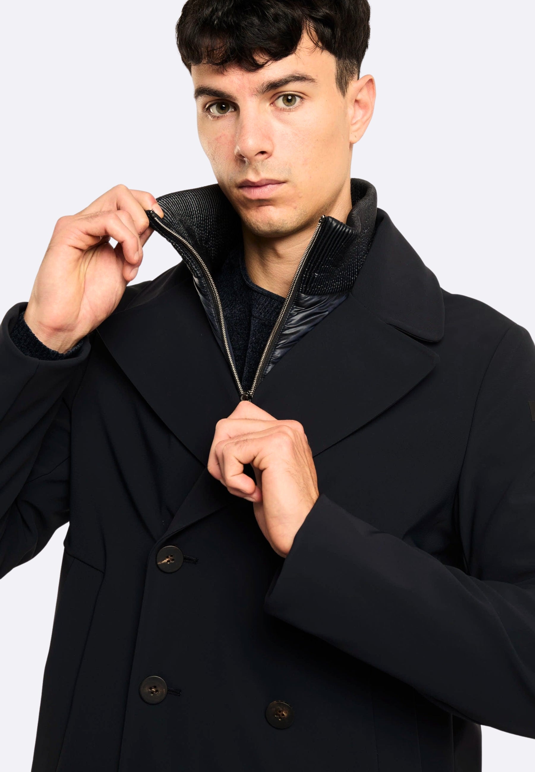 Il caban di lunghezza media, evoluto dall'amatissimo must-have del guardaroba maschile di stagione, è proposto nel tessuto a membrana Stratofabric #3 impermeabile e traspirante. Il look super opaco dello shell in esclusivo SURFLEX®, elegante e liscio al tatto, e la costruzione a termonastrature selettive interne aggiungono robustezza e un tocco di contemporaneità a un capo dall'eleganza sobria e senza tempo, ispirata dalla tradizione marinière. Nelle giornate autunnali più fredde e ventose, il capospalla offre la protezione del davantino in nylon imbottito e staccabile a mezzo zip, con il collo dolcevita arricciato a punto smock. La pregiata abbottonatura in corno chiude il doppio petto dagli ampi revers, con le tipiche tasche laterali a pistagna. Lo spacco posteriore aggiunge la massima libertà di movimento alla vestibilità regolare. L'interno presenta la fodera in caldo e pregevole velluto nero, ravvivata dal taschino interno a zip con filetti arancione e dalla tag a cuore "Made with love, designed in Tuscany". Il logo a microiniezione nero sulla manica sinistra completa questo capo continuativo di grande successo della Collezione.