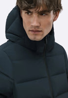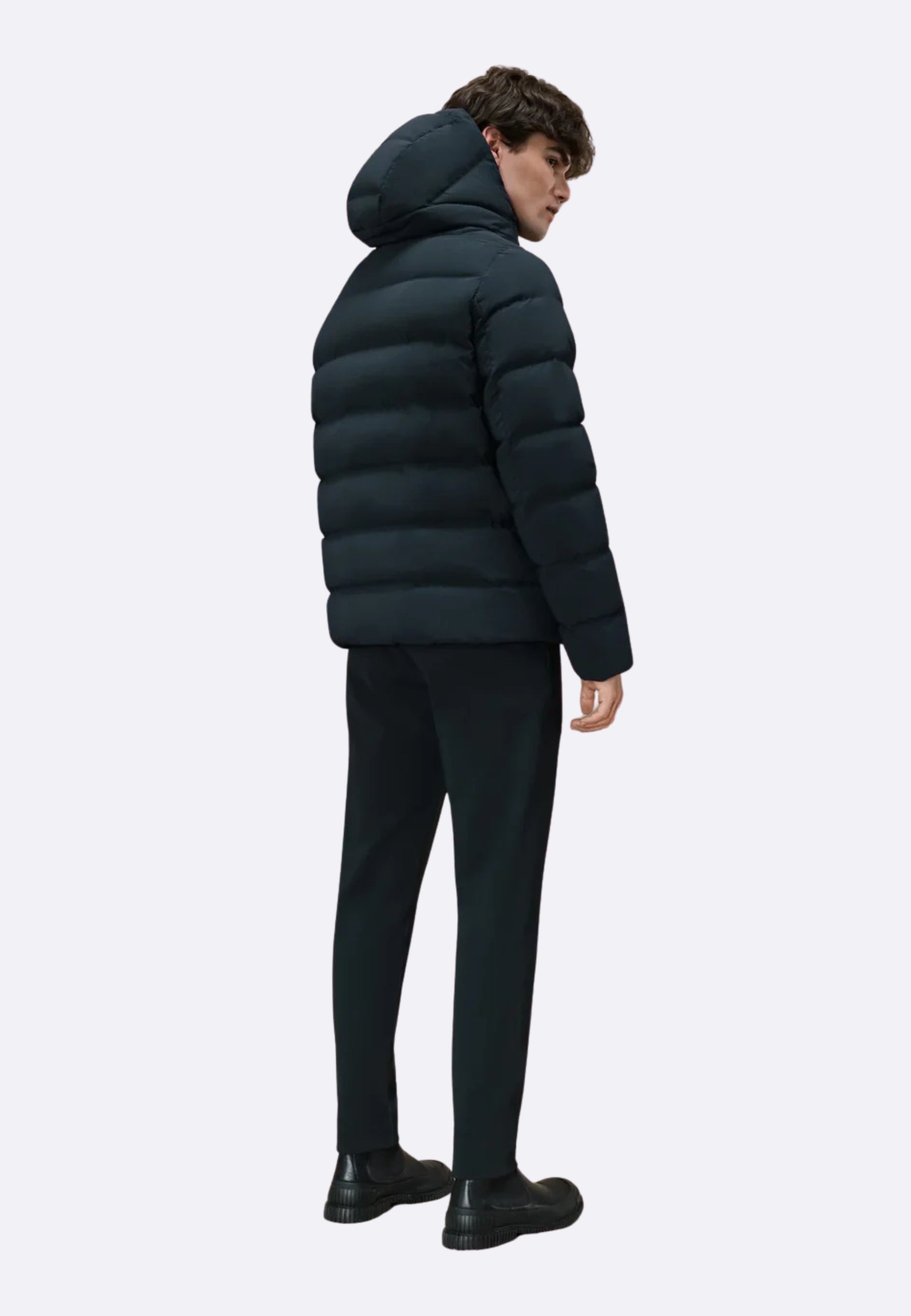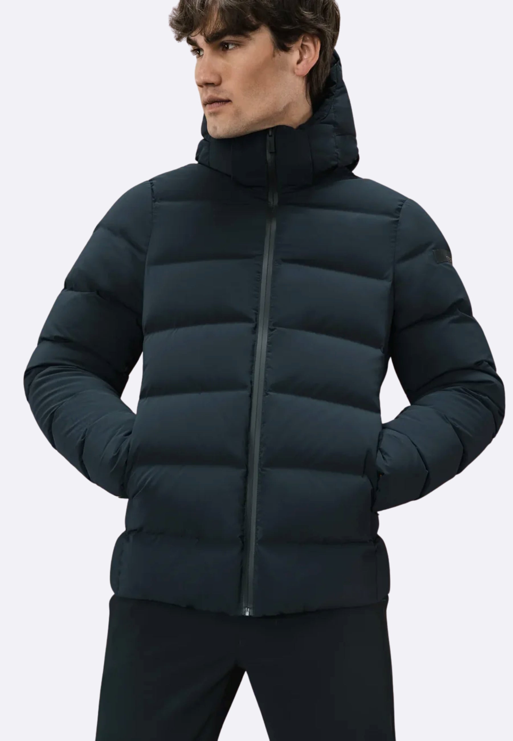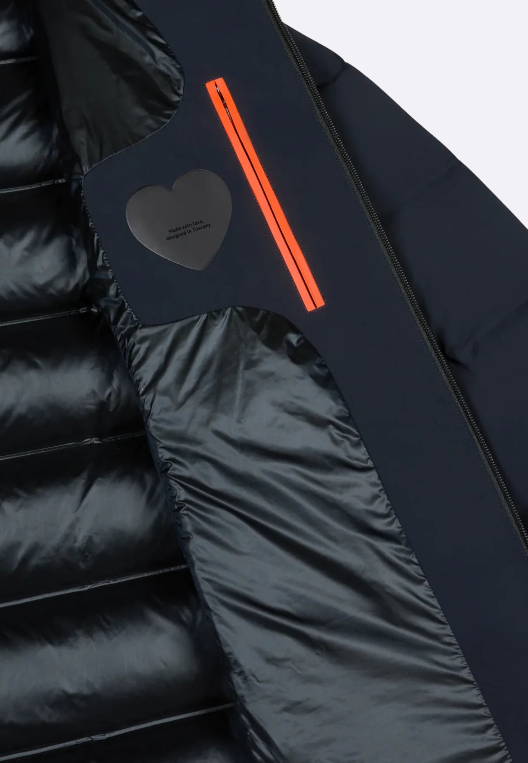 Il piumino di lunghezza media e dal fit regolare è caratterizzato dalla texture senza soluzione di continuità dei canali tubici dal touch morbido e consistente, che contengono l'imbottitura in piuma d'anatra 90/10. La costruzione ad alta densità è rinforzata dalle nastrature interne. Sul davanti, la zip spirale spalmata nera solca il pattern orizzontale del tubico da 10 cm, fino ad assicurare il collo alto e protettivo e il cappuccio avvolgente fisso. Le tasche laterali sono provviste di zip invisibile, mentre l'interno è dotato di un taschino con zip invisibile, impreziosito dal doppio filetto arancione e dalla tag a cuore "Made with love, designed in Tuscany". Il logo a microiniezione nero sulla manica sinistra firma un capospalla perfetto per tutti coloro che cercano calore e leggerezza in ogni situazione.