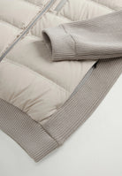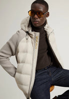 Un modello perfetto per la stagione fredda, avvolgente e funzionale. Realizzata in nylon elasticizzato, questa giacca ibrida è idrorepellente e resistente al vento ed è imbottita in piuma d’anatra. È caratterizzata da una finitura opaca e una trapuntatura orizzontale. Il modello presenta cappuccio rimovibile, regolabile con fermacorda e visiera con logo, zip bidirezionale e tre pratiche tasche, tutte con cerniera: una sul petto e due laterali. Le maniche raglan, i fianchi e il fondo sono realizzati in tessuto tecnico di misto viscosa a costine. Il logo sulla parte interna dell'abbottonatura, visibile solo quando il piumino è aperto.