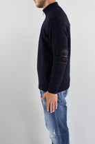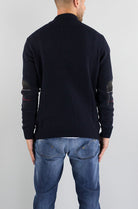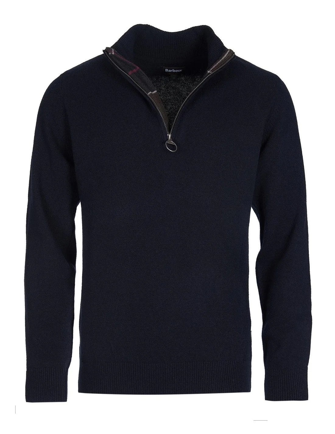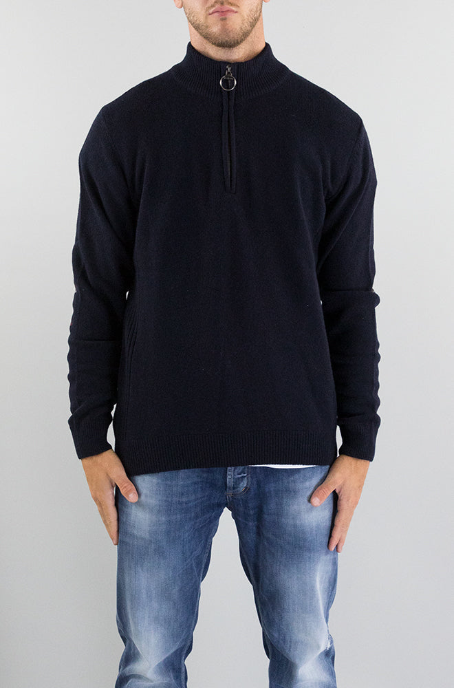 The Barbour Black Sweater features long sleeves and a high collar with zip fastening. Checked elbow patches add a distinctive touch. Crafted from 100% wool, it combines warmth with style. The model is wearing a size L and is 1.80m tall.