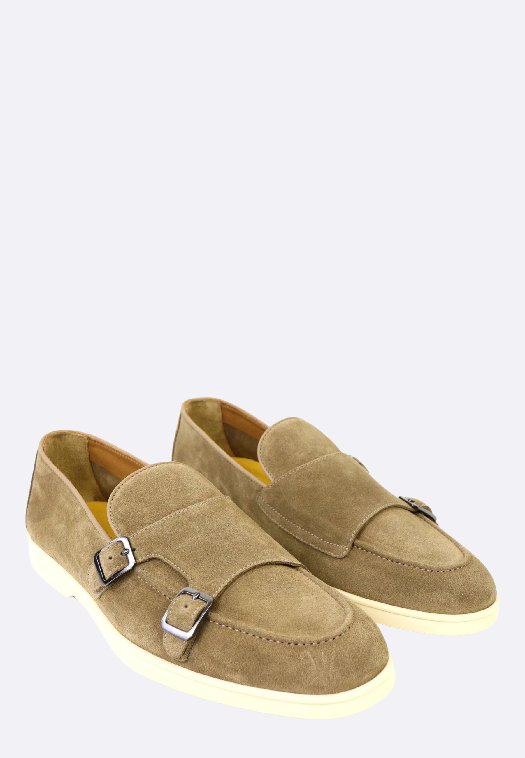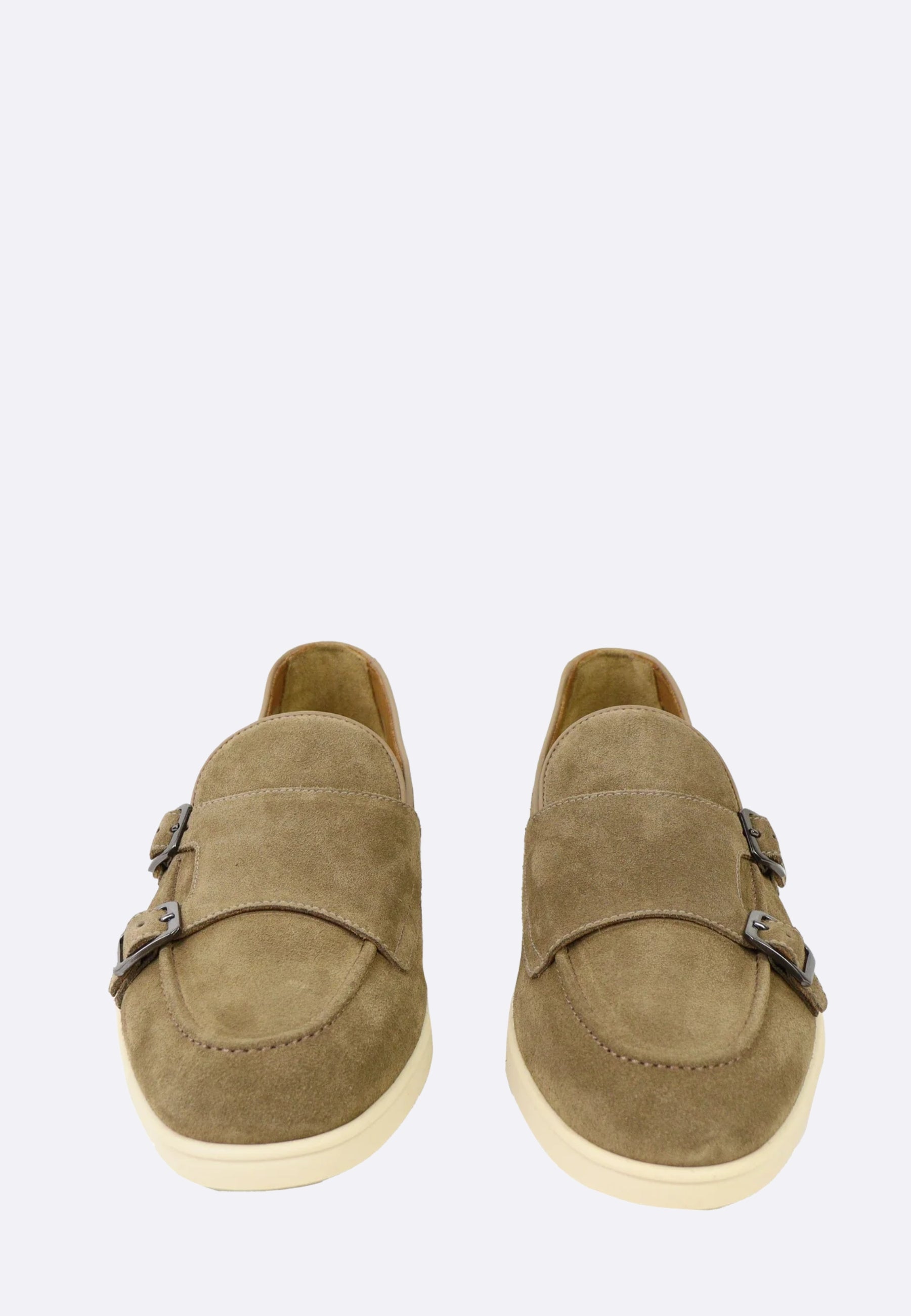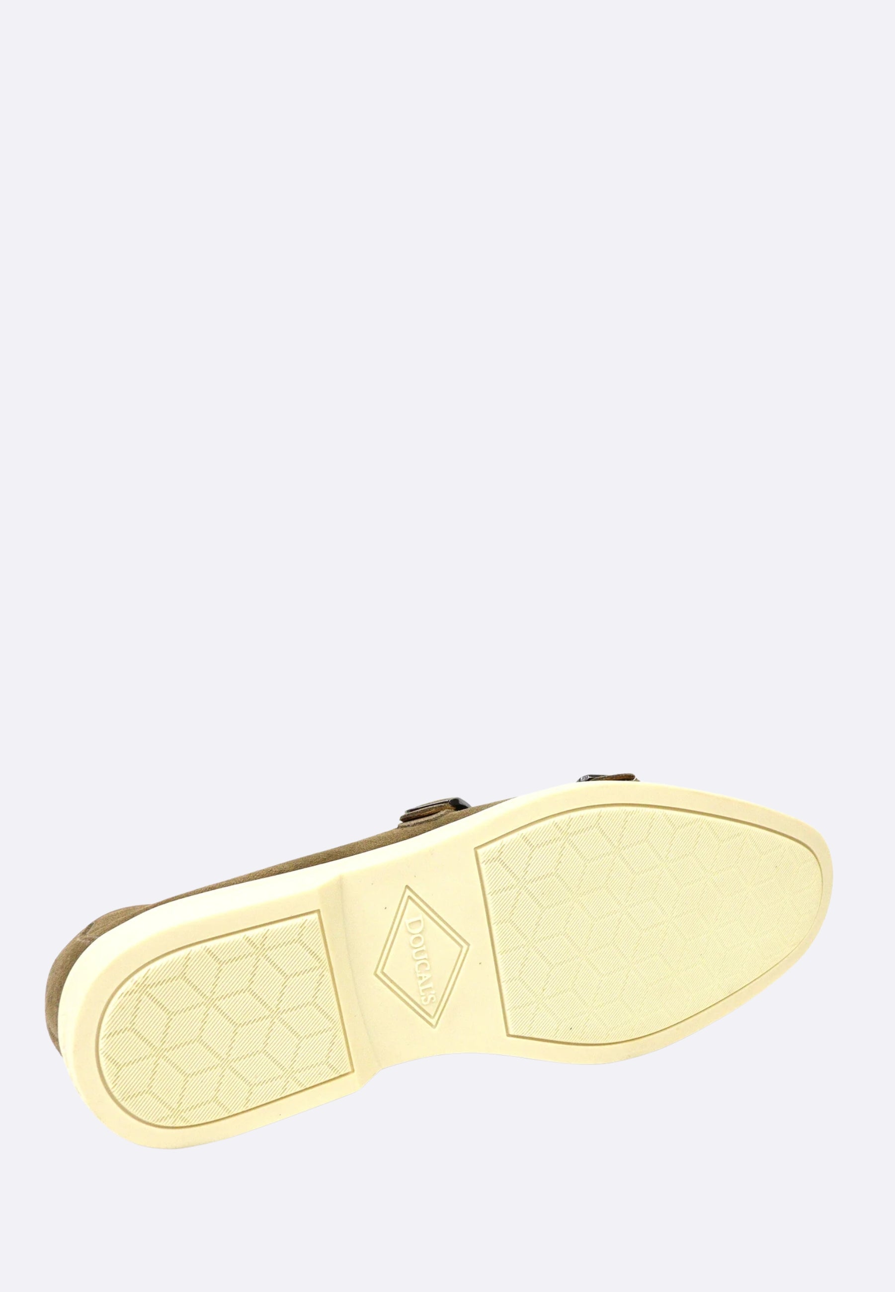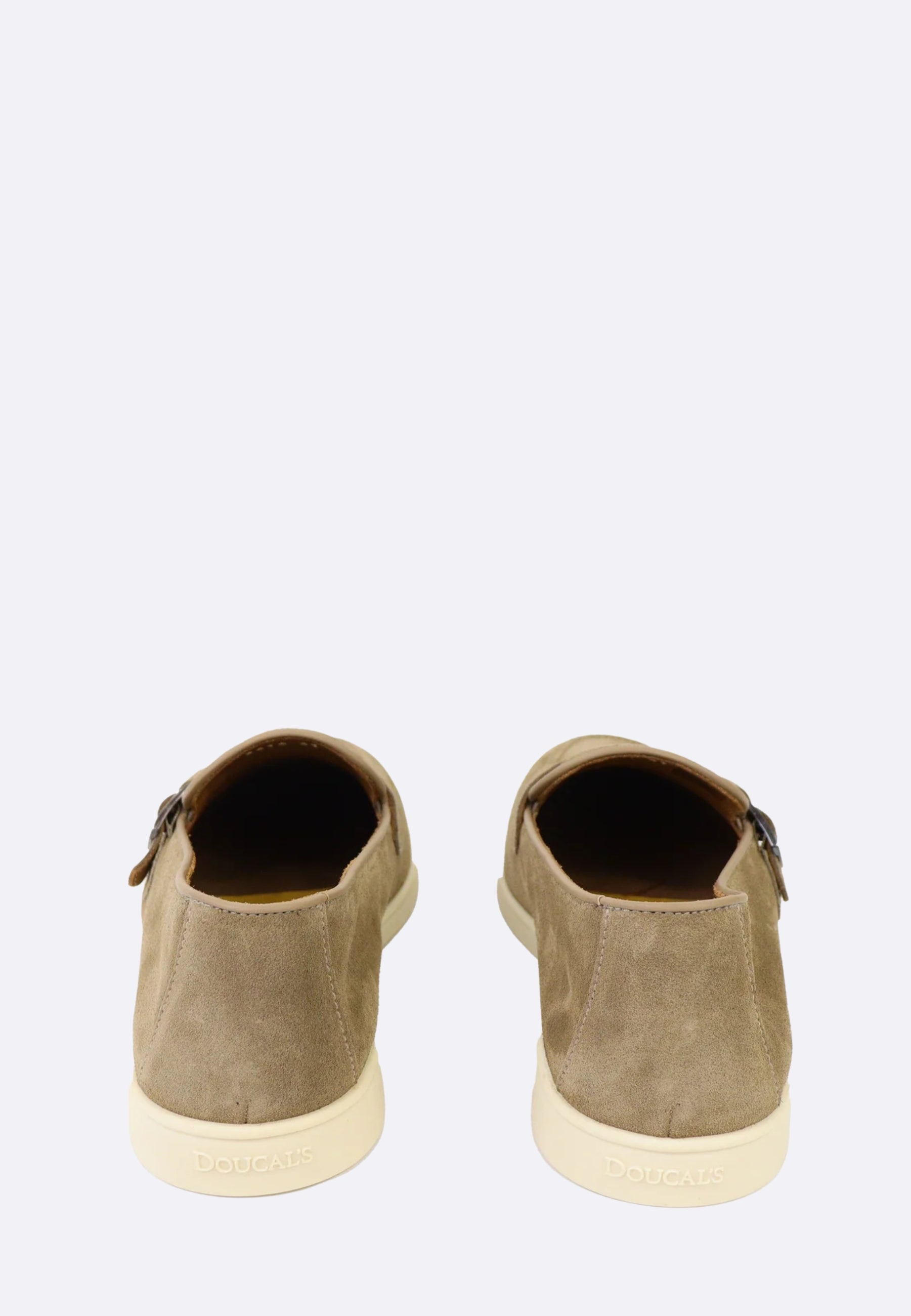 Taupe moccasin by DOUCALS in suede with double buckle. Rubber sole.