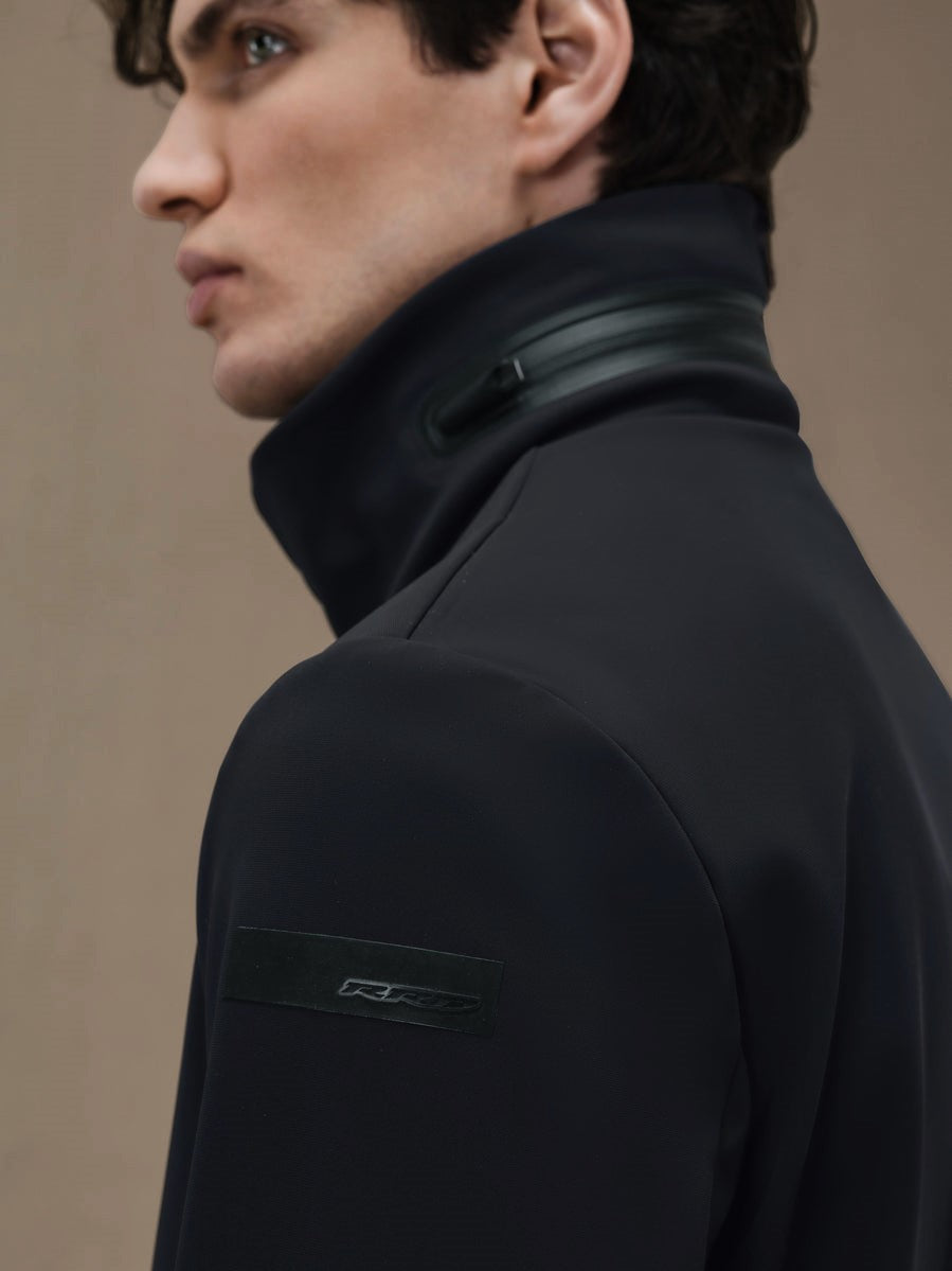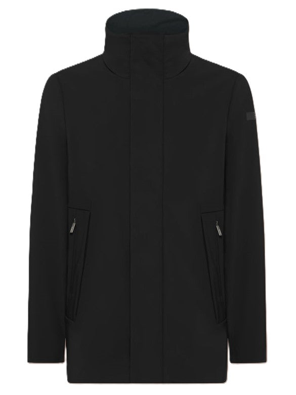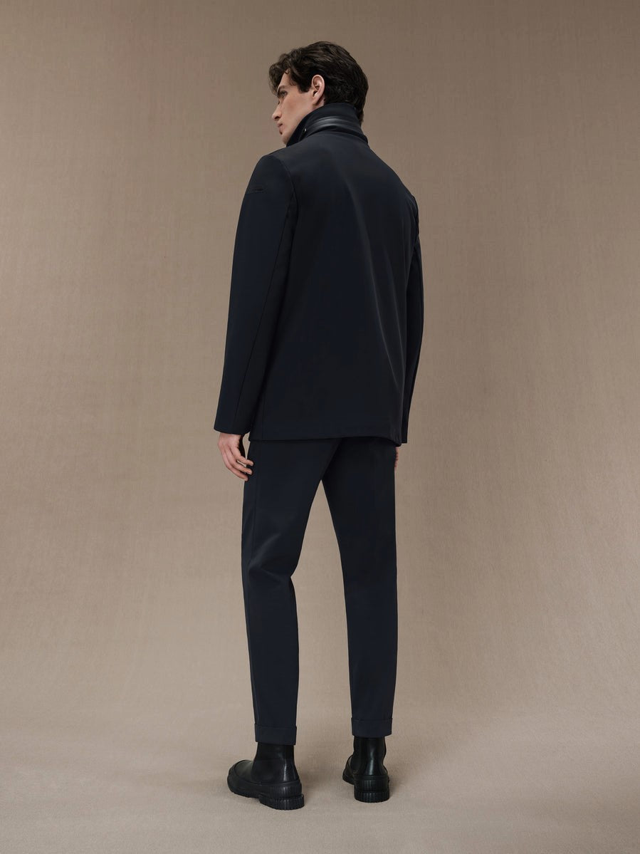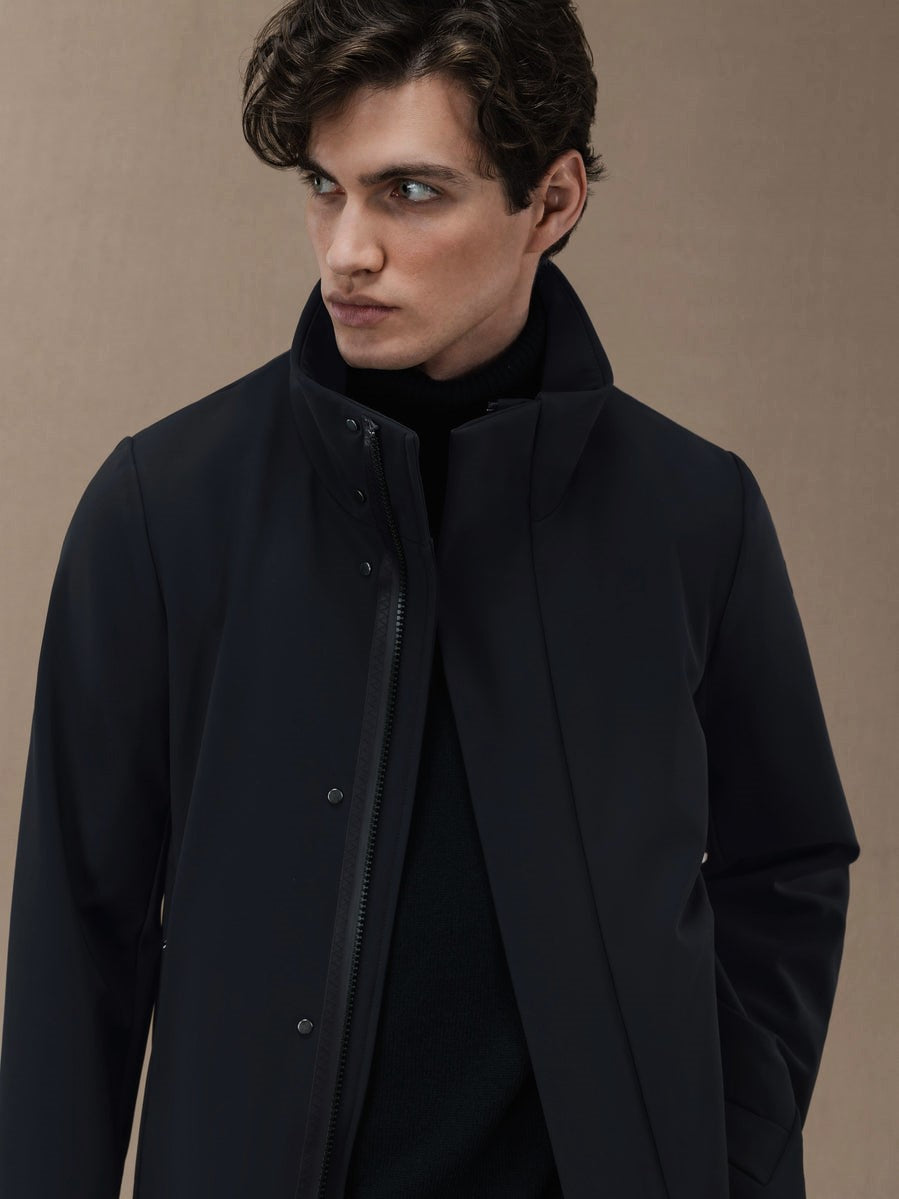 Winter Thermo Mdm Jkt. Ahead of the times and trends, this winter coat with very clean lines and a refined design, available in the season's sober and elegant colors. The visible elements are reduced to a minimum: the double-slider zip closure on the front is hidden by the flap with metal press studs. The high and protective hood of the collar is hidden by an invisible zip. The jacket has several side pockets on each side, as practical as they are discreet: two overlapping welt pockets, plus a vertical one with an invisible zip. The cuffs are adjusted by the press stud. The waterproof and breathable Stratofabric#3 membrane fabric stands out for the super opaque look of the exclusive SURFLEX® and for the fine velvet lining. The interior features a pocket with an invisible zip, enlivened by the double fluorescent orange piping. The black micro-injection logo on the left sleeve signs a versatile overcoat for professional occasions.