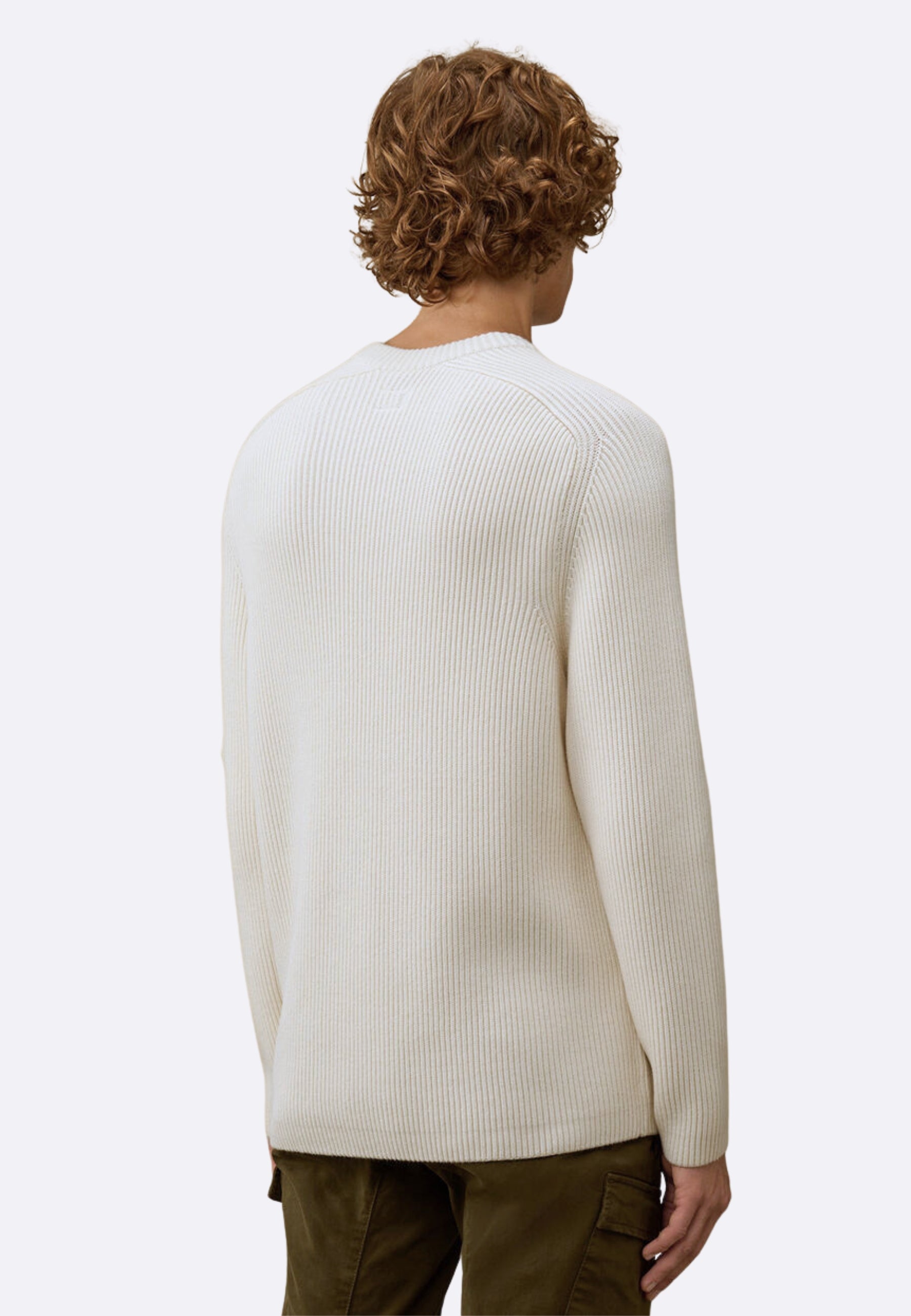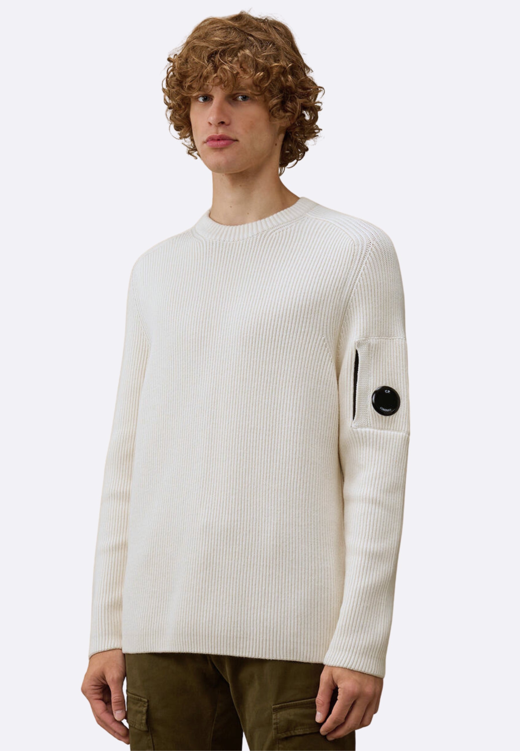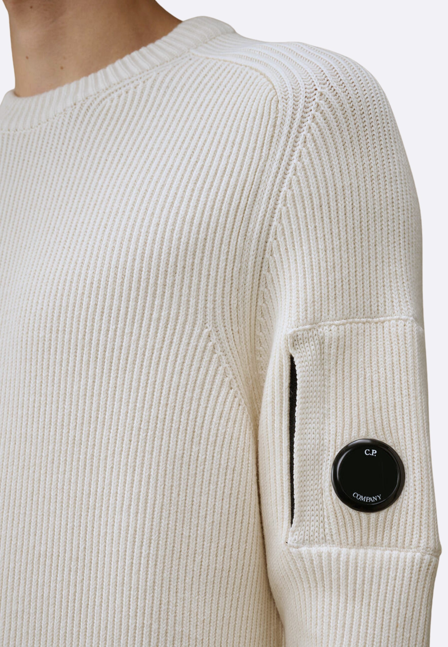 C.P. Company Maglia a Coste Bianca - Full Rib Crewneck Lens Sweater