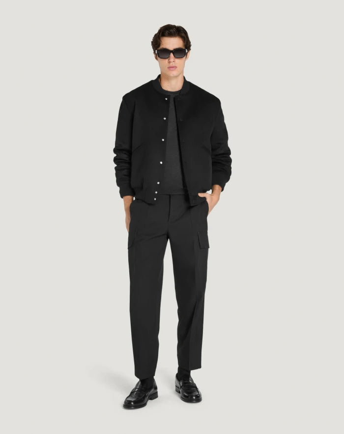 Trousers in stretch cotton and wool fabric, with a compact and modern look, perfect even in the transition from season to season. The design of the model, with maxi pockets on the sides and a soft line slightly narrower at the bottom, makes them perfect for updating the style of free time.