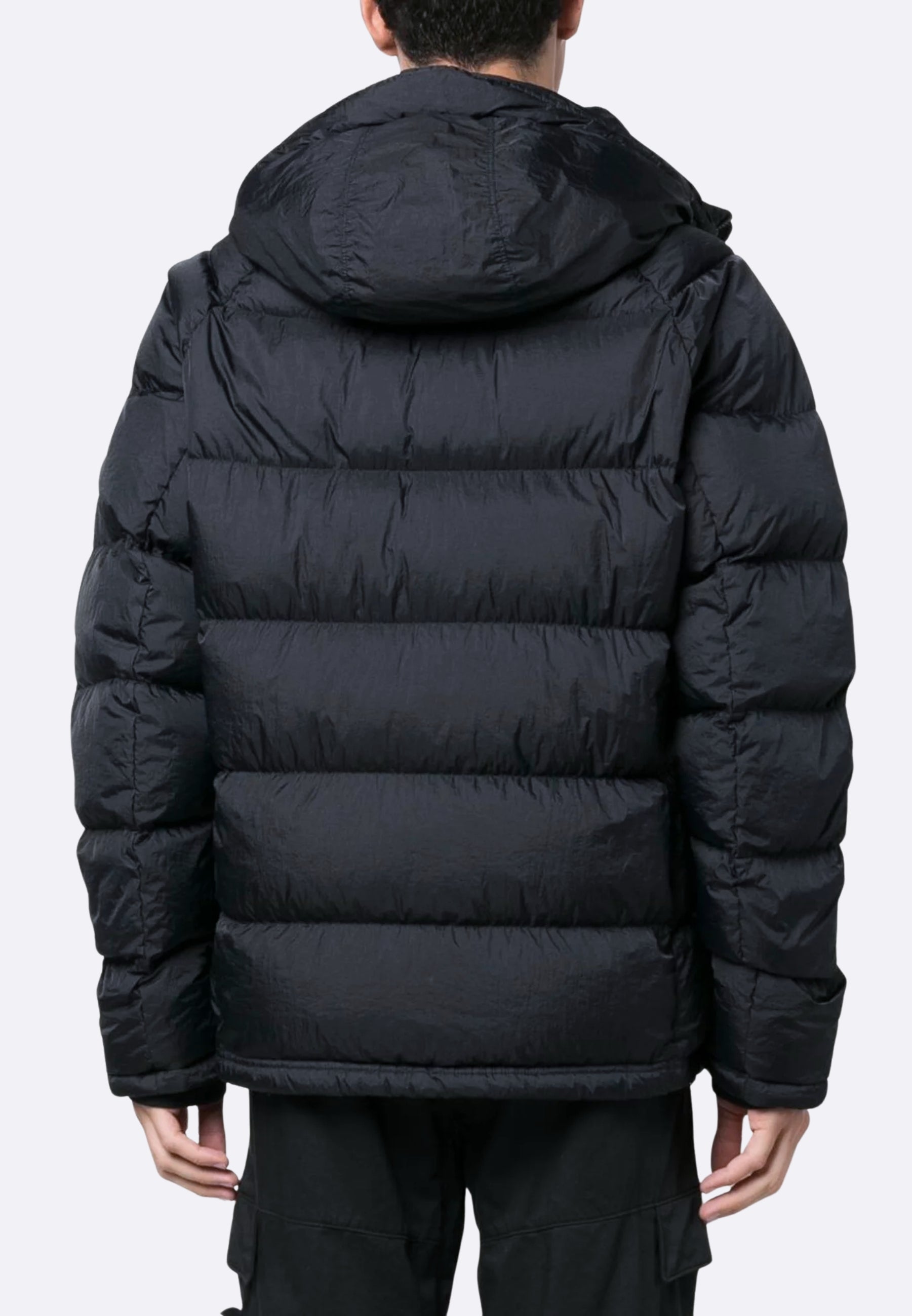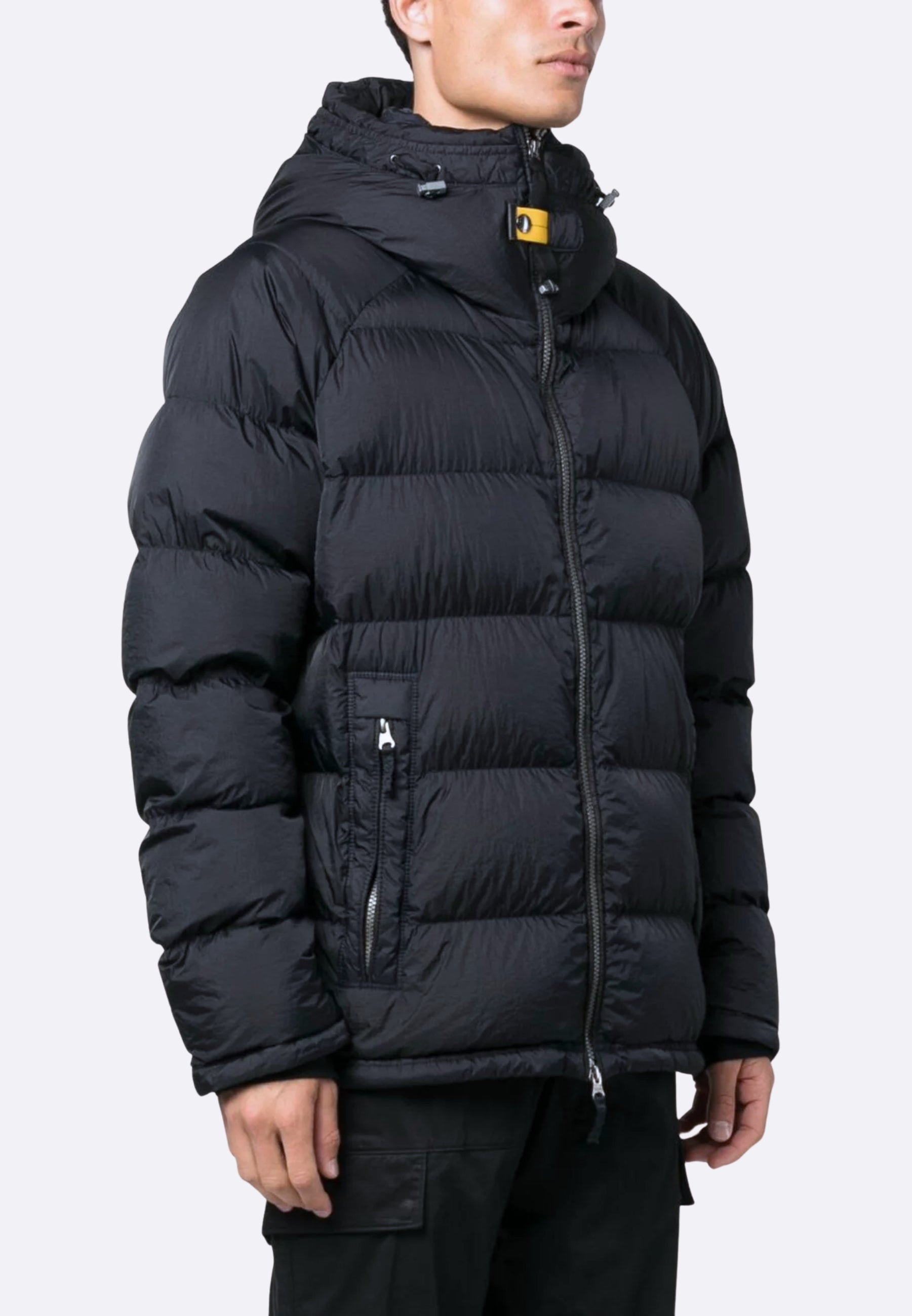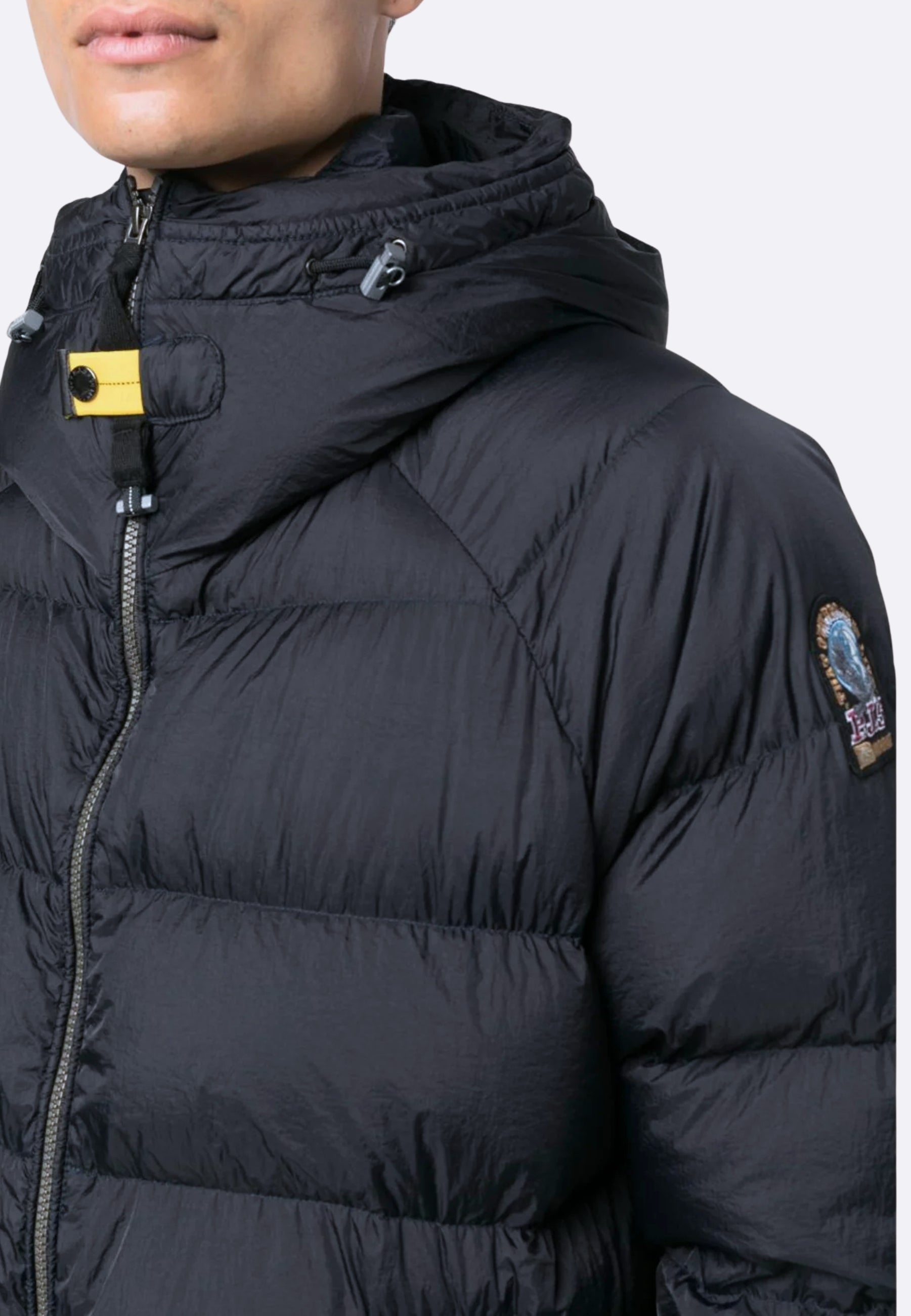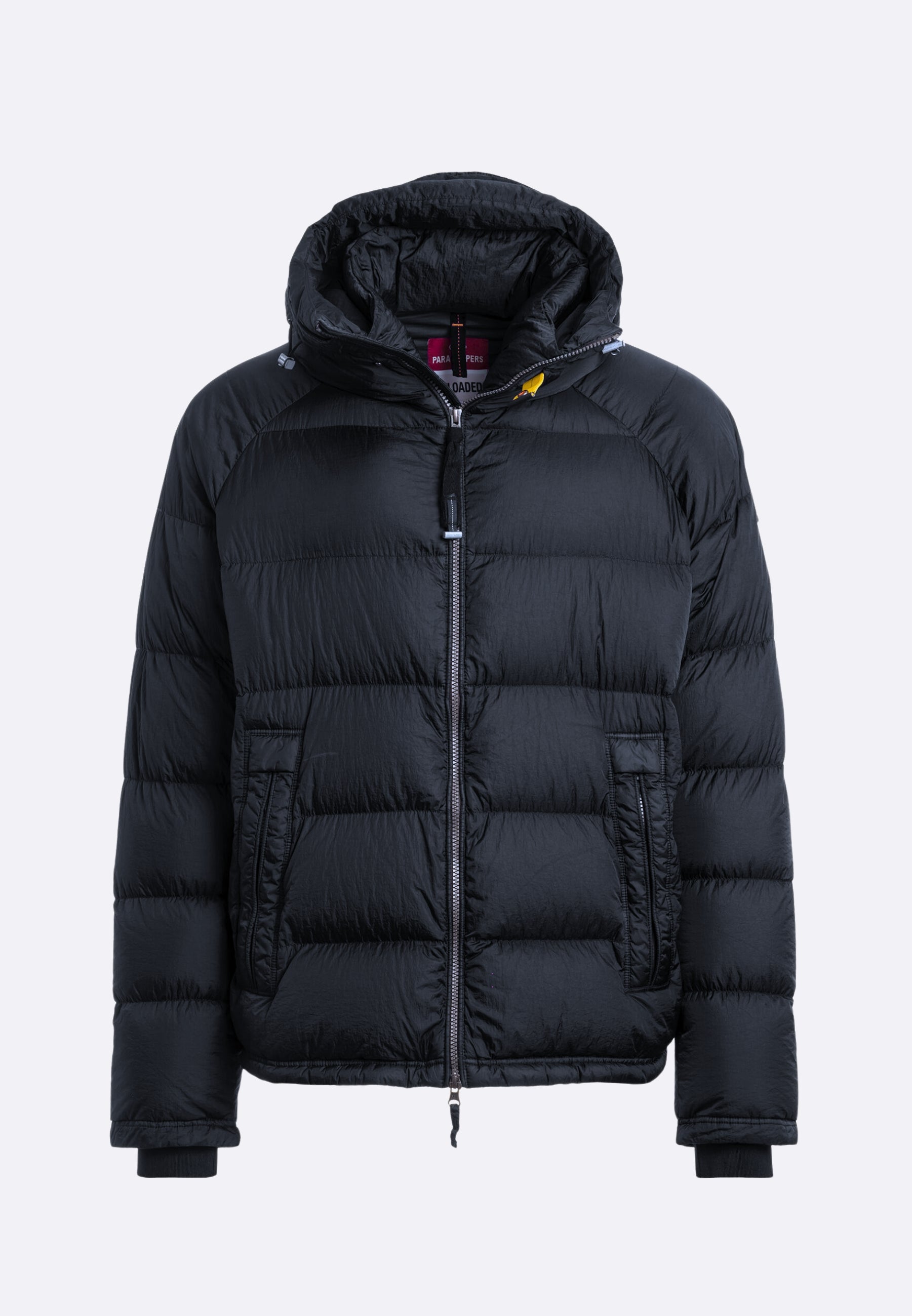 Piumino uomo Parajumpers "Norton" in colore nero, realizzato in leggero popeline di nylon tinto in capo con coating poliuretanico sul retro che ne aumenta la resistenza. La fodera è in nylon ripstop, mentre limbottitura in piuma danatra certificata, con fill power 740, assicura calore e leggerezza.